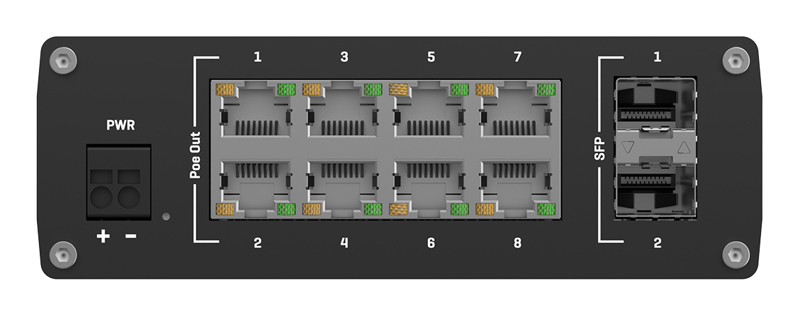 Teltonika TSW200. Switch type: Unmanaged. Type basis-switching RJ-45 Ethernet-poorten: Gigabit Ethernet (10/100/1000), Aantal basis-switching RJ-45 Ethernet-poorten: 8. MAC-adrestabel: 2000 entries, Switchingcapaciteit: 20 Gbit/s. Netwerkstandaard: IEEE 802.3i, IEEE 802.3u, IEEE 802.3ab, IEEE 802.3x, IEEE 802.3az, IEEE 802.3af, IEEE 802.3at. DC voltage input: 7 - 57 V. Netstekker: DC-in ingang. Power over Ethernet (PoE). Ophangsysteem voor aan de muur