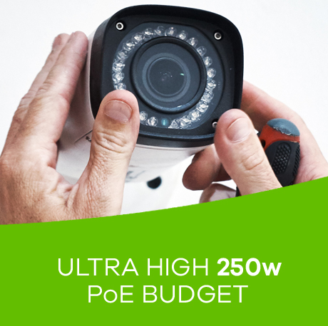 The GS1300 series includes 3 models with a range of large power budgets from 130 W to 250 W accommodating the requirement for powering up multiple IP cameras. The intuitive LED indicator on the front panel allows inspecting real-time PoE status.