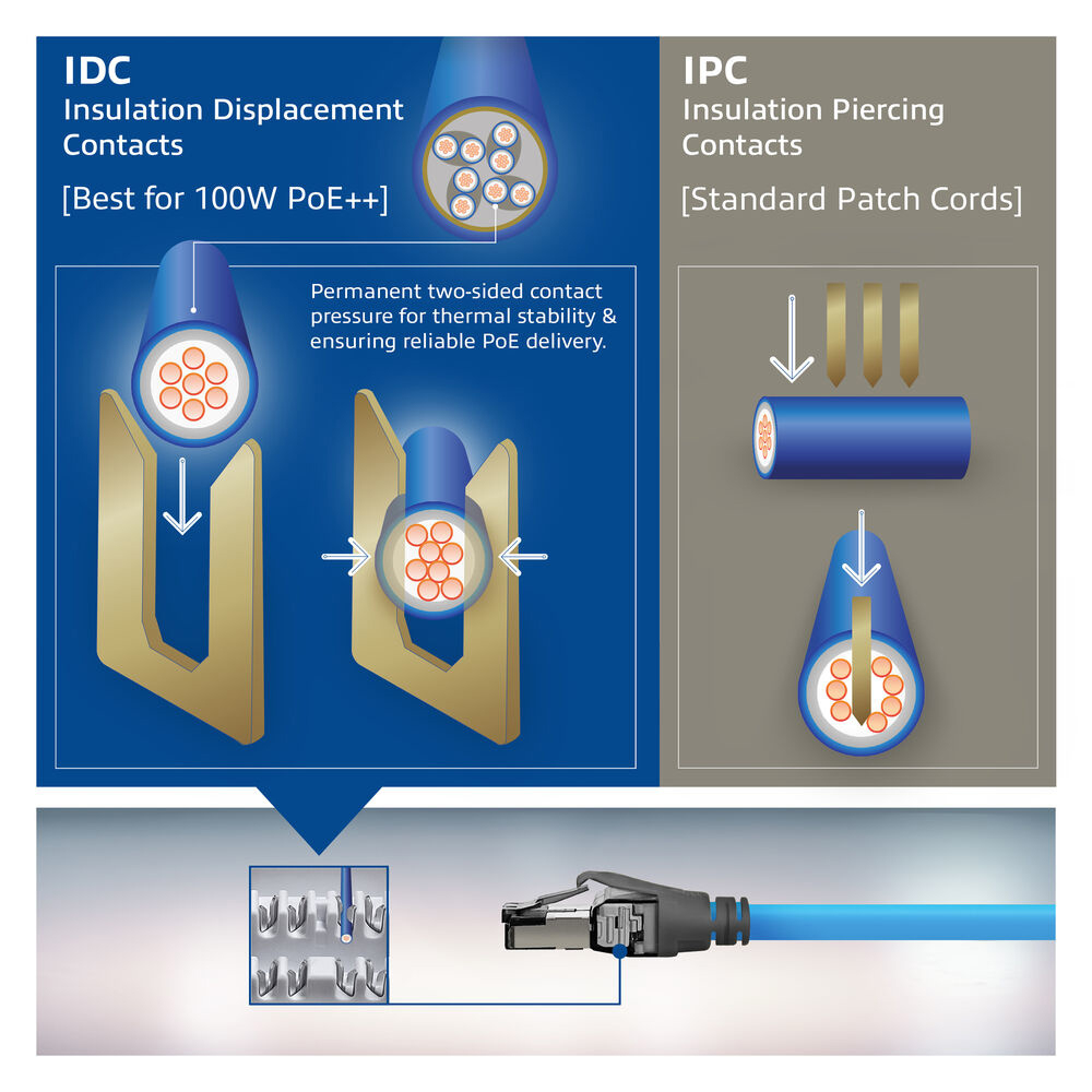Deze vaste installatiekabels zijn ontworpen voor 100W Power over Ethernet-toepassingen vanwege het gebruik van IDC (Insulation Displacement Contacts). Deze ACT prefab kabelassemblage heeft 23AWG koperen aders en IDC-connectoren, voor een stabiele en langdurige netwerkverbinding. Ideaal voor 4PPoE 100W (type 4) toepassingen.