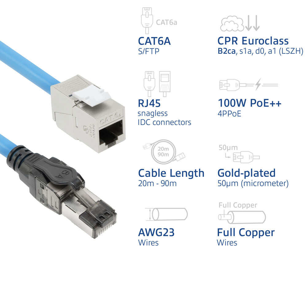 Blauw 20 meter S/FTP CAT6A B2ca PoE++ 100W solid prefab installatiekabel, RJ45 male – female