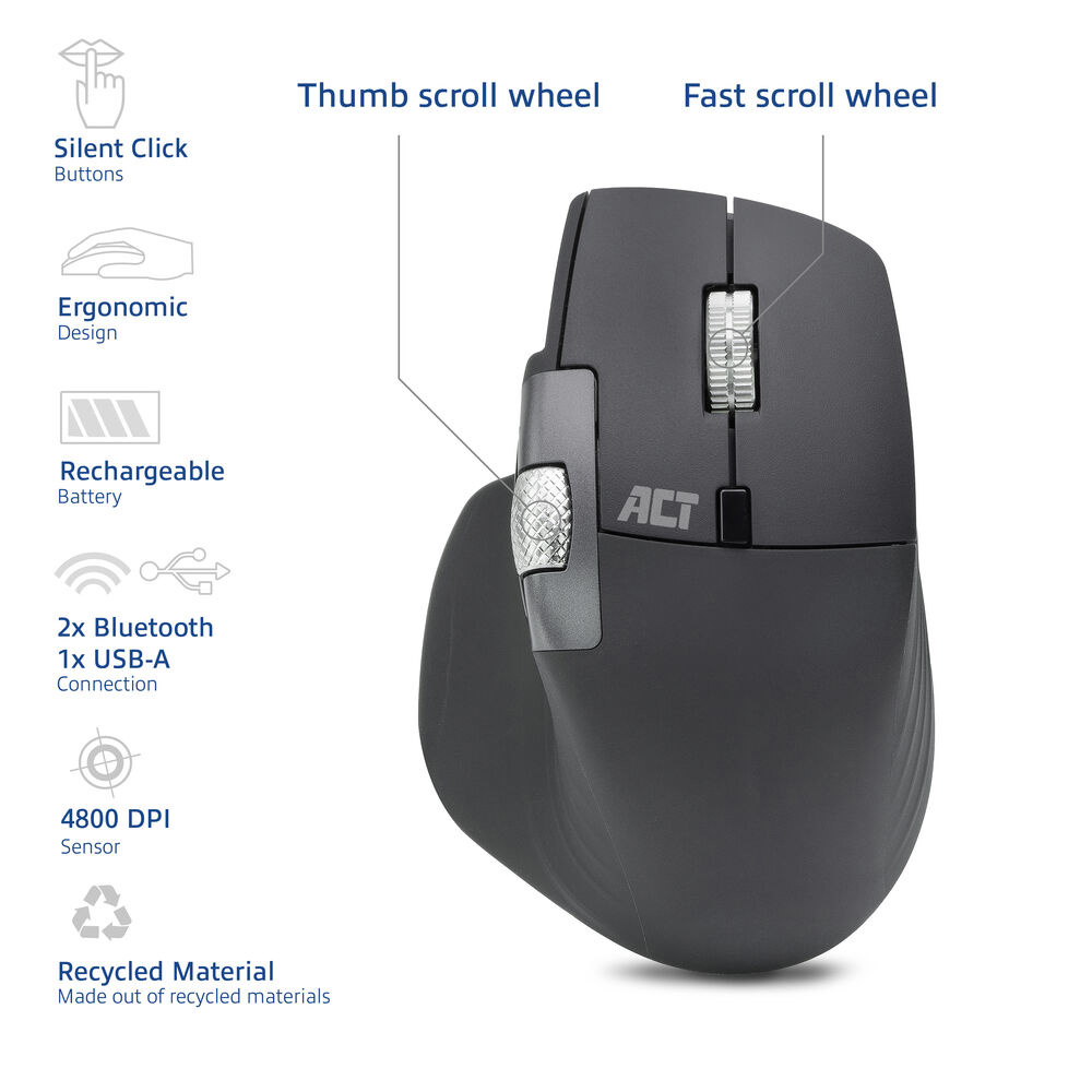 De ACT AC5147 draadloze multi-connect muis met oplaadbare batterij is ideaal voor gebruik op kantoor, thuis of onderweg. Verbind de muis met maximaal 3 apparaten tegelijk: 2x via Bluetooth en 1x met de USB-A-ontvanger. De muis heeft een 4800 DPI-sensor voor hoge precisie, stille kliktechnologie, een metalen scrolwiel voor snel scrollen en een duimscrolwiel voor horizontaal scrollen. Bovendien is de muis gemaakt van 85% gerecycled materiaal. ACT is een Nederlands merk en biedt 5 jaar garantie.