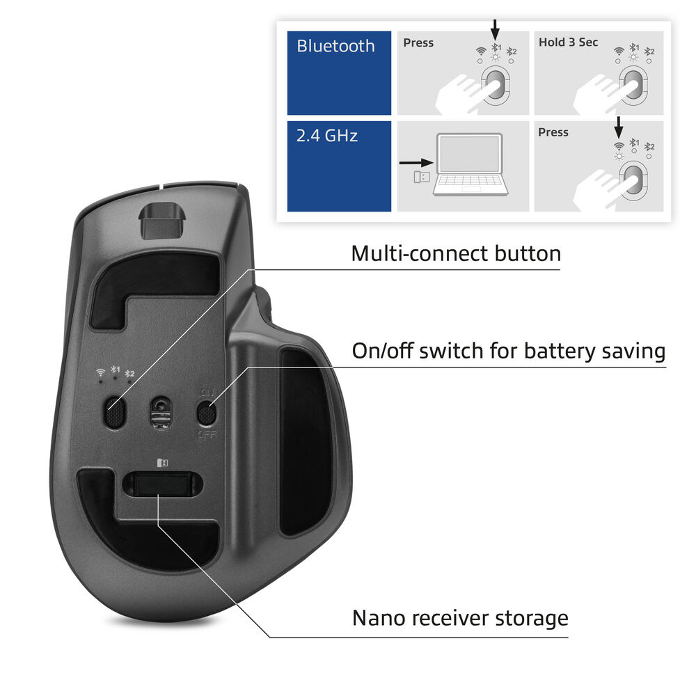 Verbind de muis eenvoudig met drie apparaten tegelijk: twee apparaten via Bluetooth en één apparaat met de USB-A-ontvanger. De USB-A-ontvanger berg je eenvoudig op in de muis zelf. Met de knop aan de onderzijde van de muis kies je het actieve apparaat.