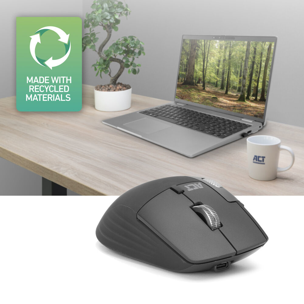 ACT Draadloze multi-connect muis Bluetooth en USB ontvanger, oplaadbaar, 4800 DPI met stille klik, snel scrolwiel en duimscrolwiel, gemaakt van gerecyclede materialen, Rechtshandig, Laser, RF-draadloos + Bluetooth, 4800 DPI, Grijs