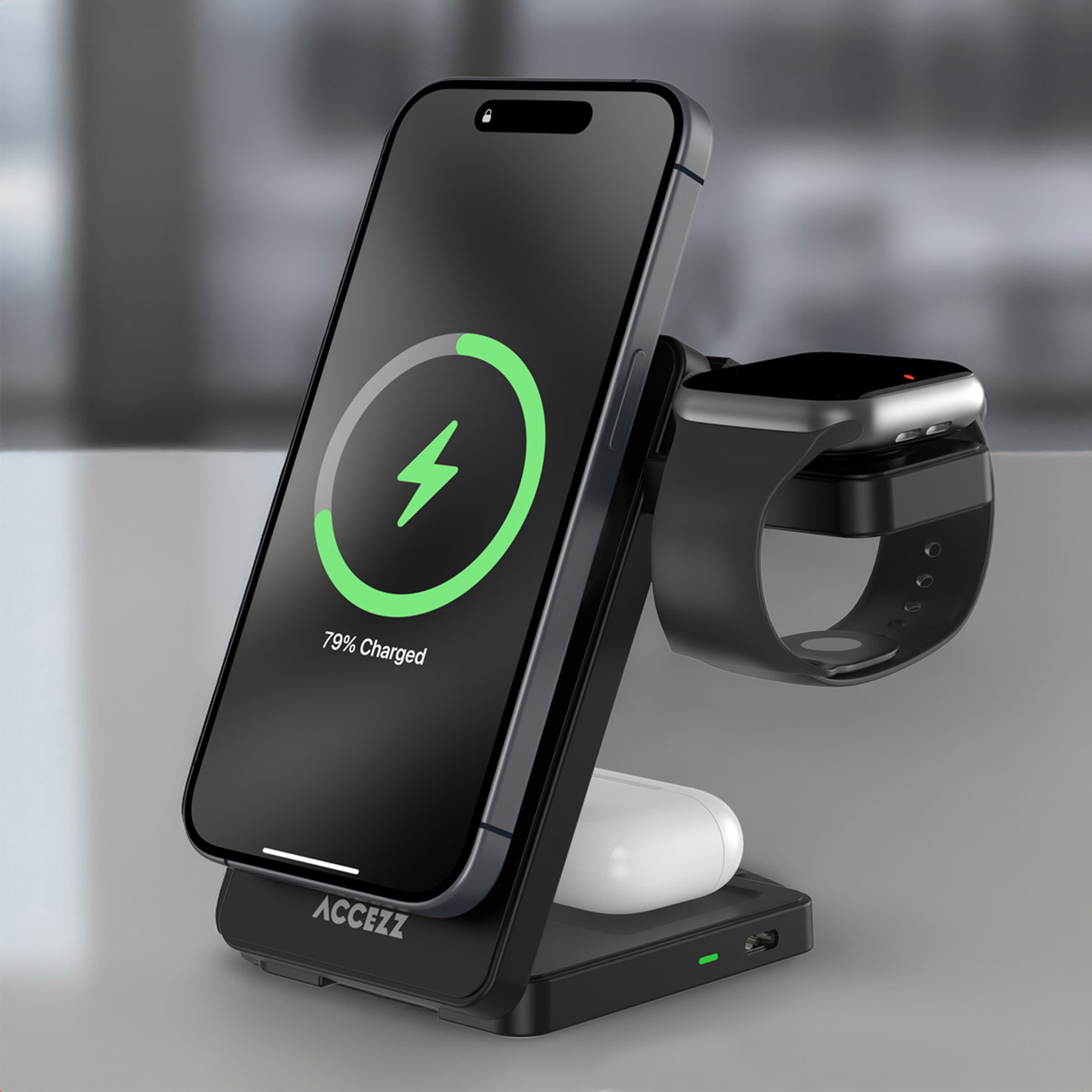 Accezz 3-in-1 Foldable Magnetic Wireless Charger, Binnen, USB, Draadloos opladen, 0,3 m, Zwart