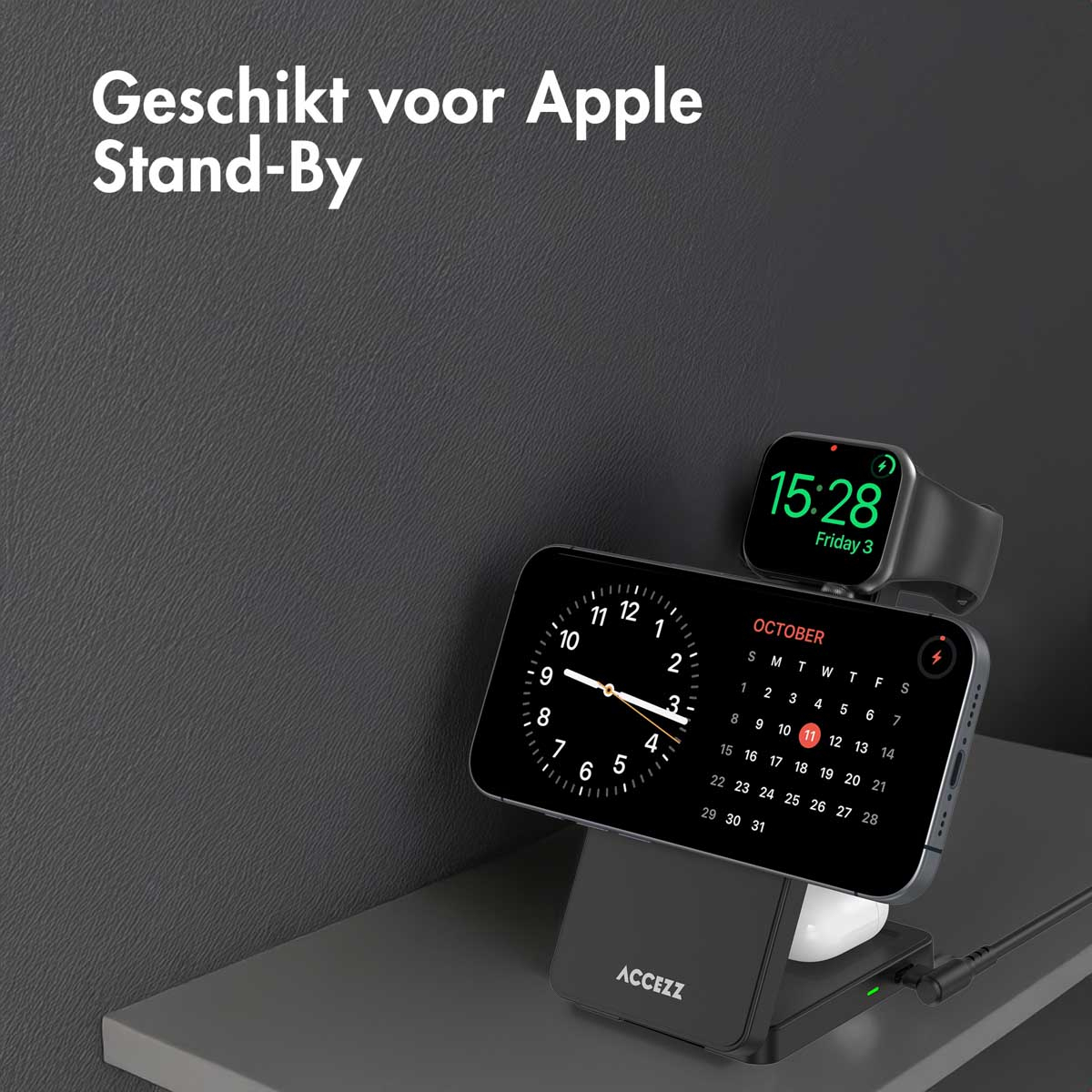 Let op: de oplader werkt alleen wanneer deze is aangesloten op een oplaadkabel en een adapter. De lader is dus niet geschikt om te worden aangesloten op een USB-poort van een computer/laptop. Geschikt voor Apple Stand-By De Accezz 3-in-1 MagSafe oplader is perfect voor op je nachtkastje.
