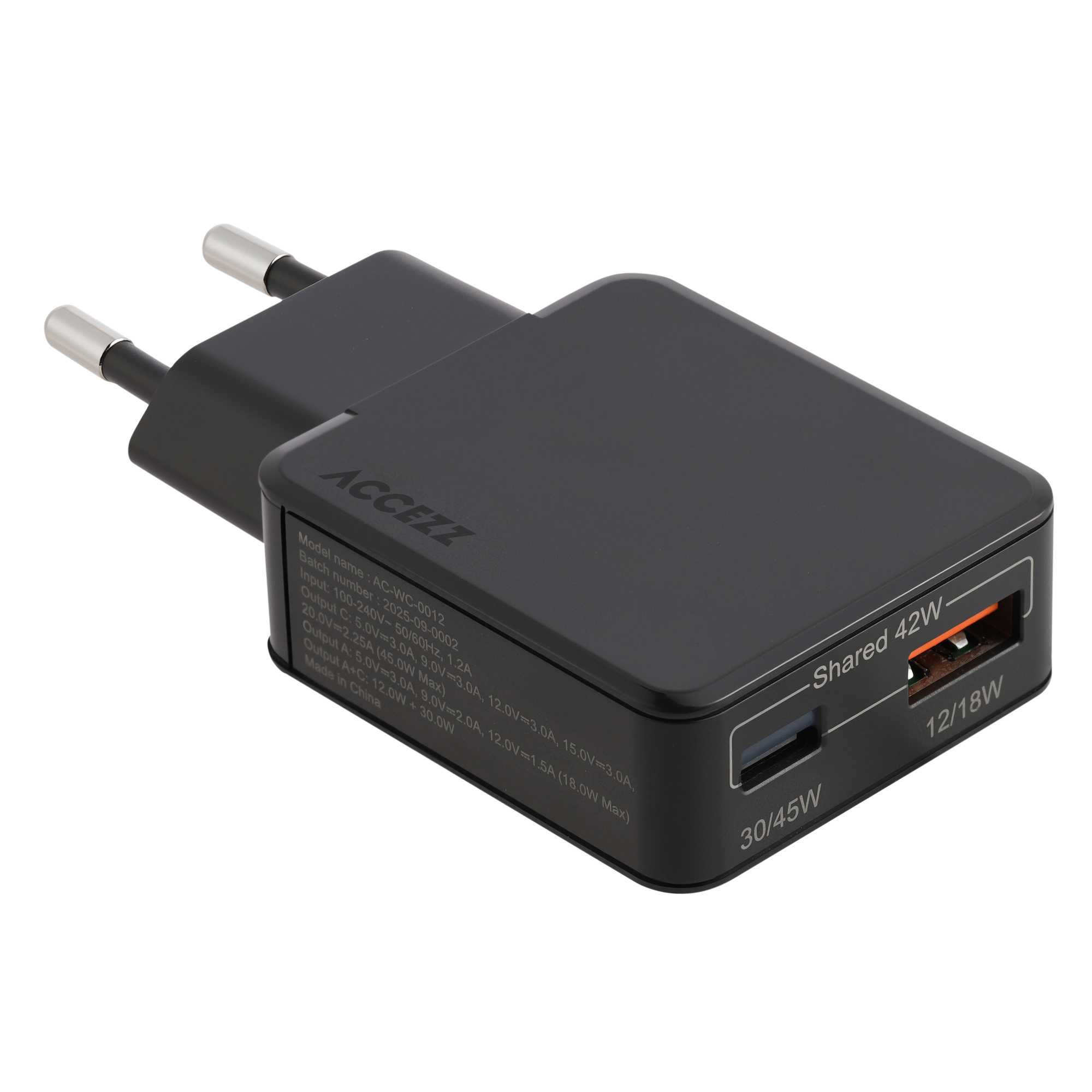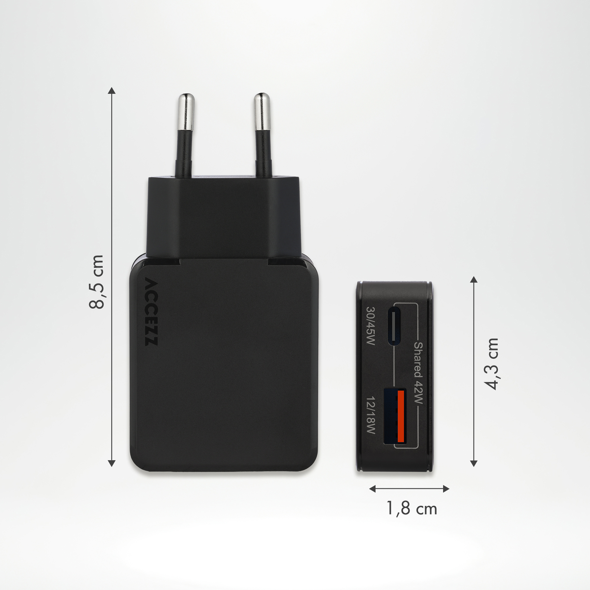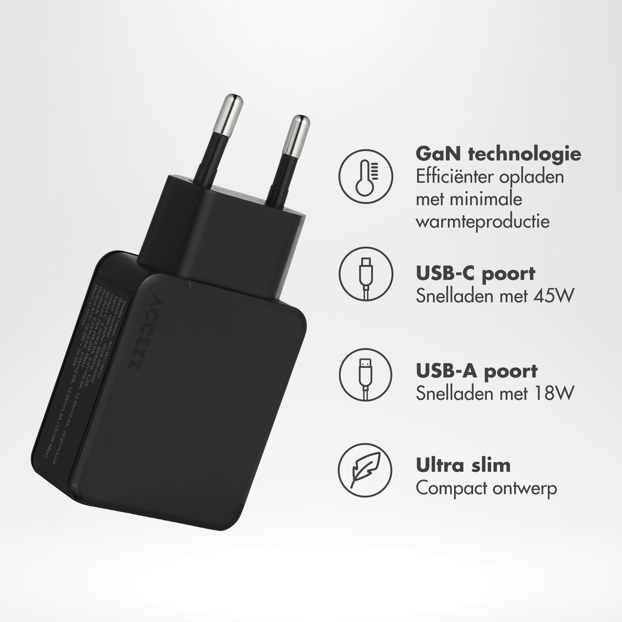 Accezz Ultra Slim GaN Charger 45W - USB-A + USB-C, Binnen, AC, Zwart