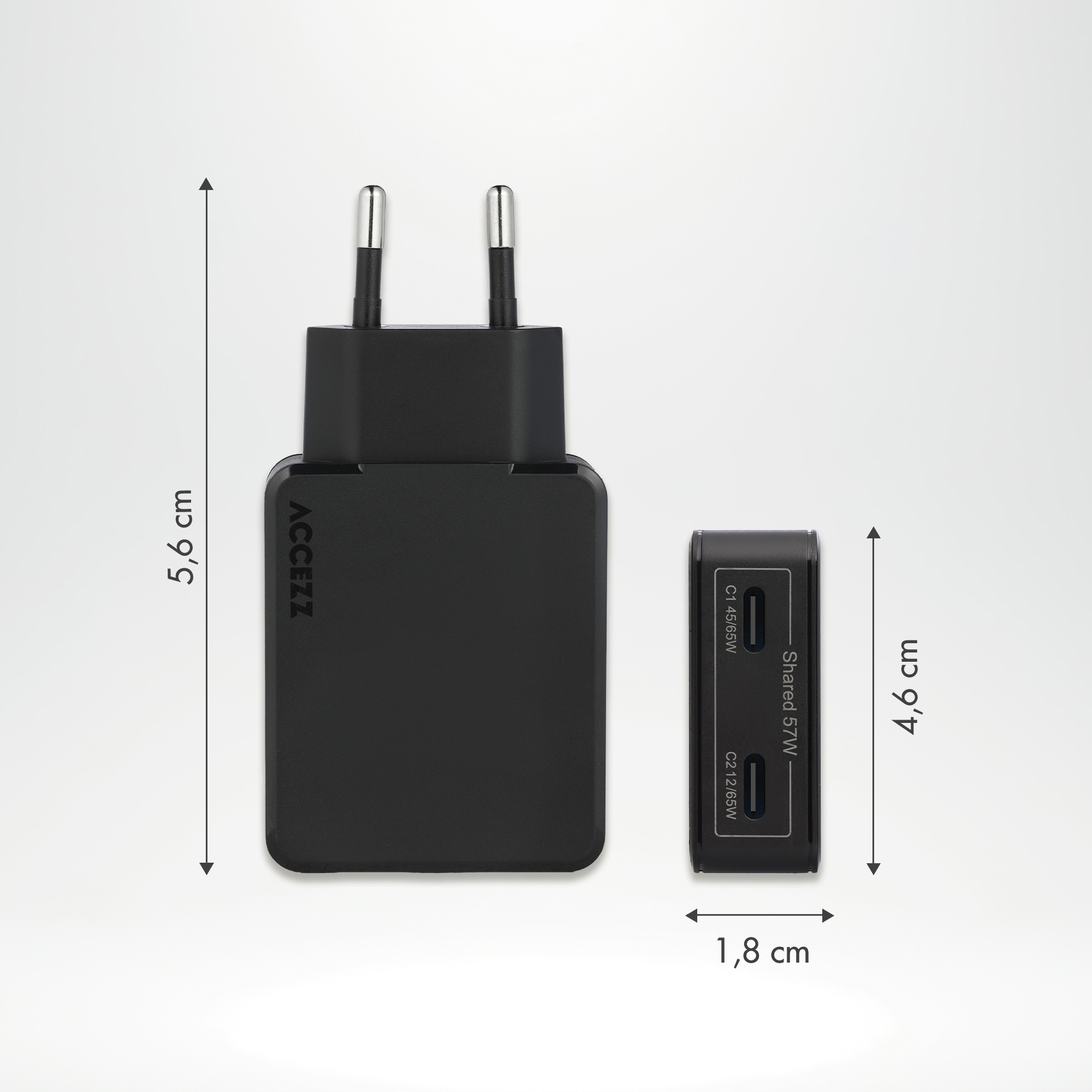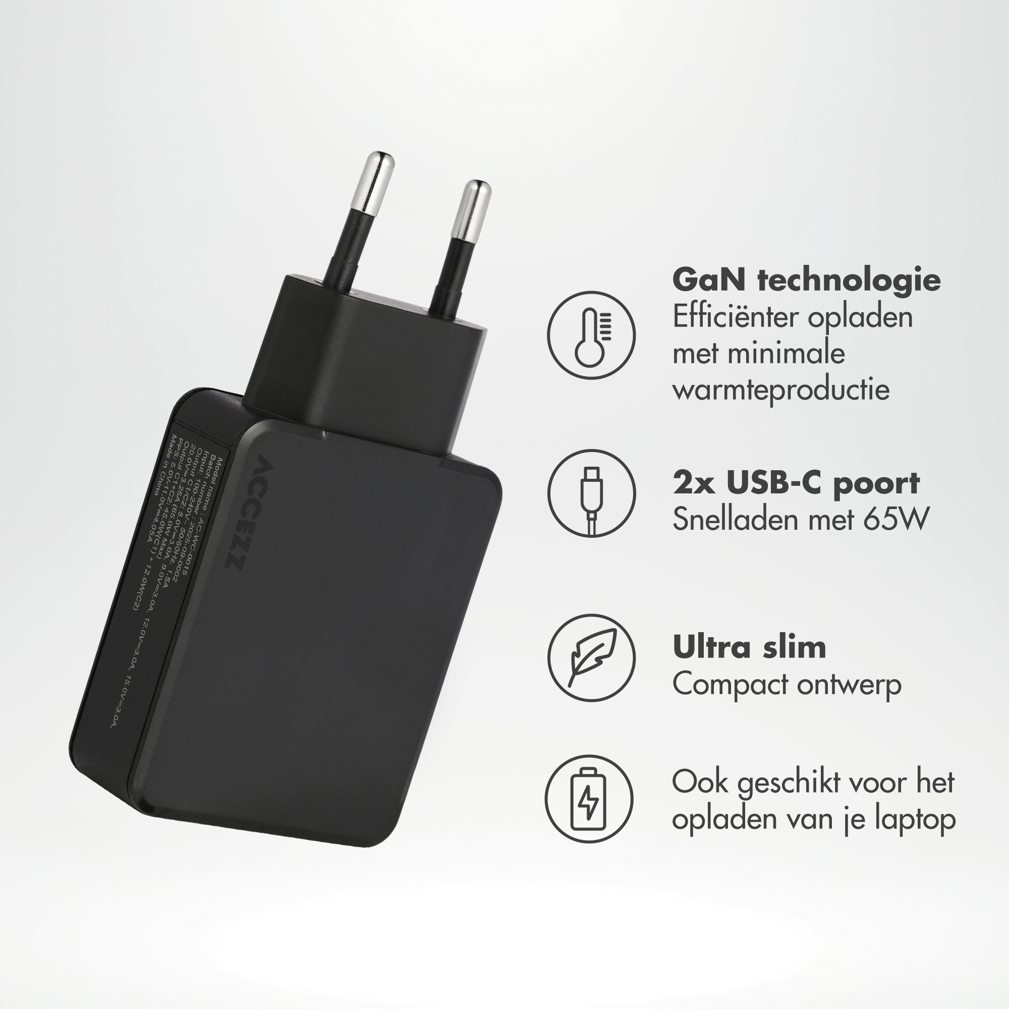 Accezz Ultra Slim GaN Charger 65W - 2x USB-C, Binnen, AC, Zwart