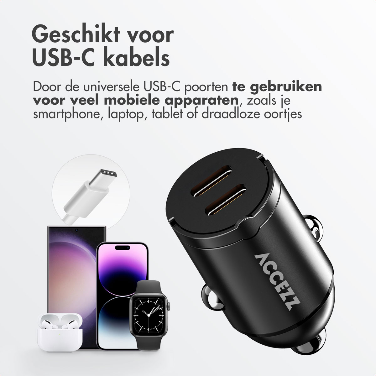 Met de Accezz autolader laad je onderweg razendsnel je apparaten op. Dankzij de dubbele USB-C poorten en Power Delivery 3.0 technologie kun je ook snelladen of twee apparaten tegelijk opladen. En met 65 watt vermogen laad je naast een smartphone of tablet ook je laptop op.