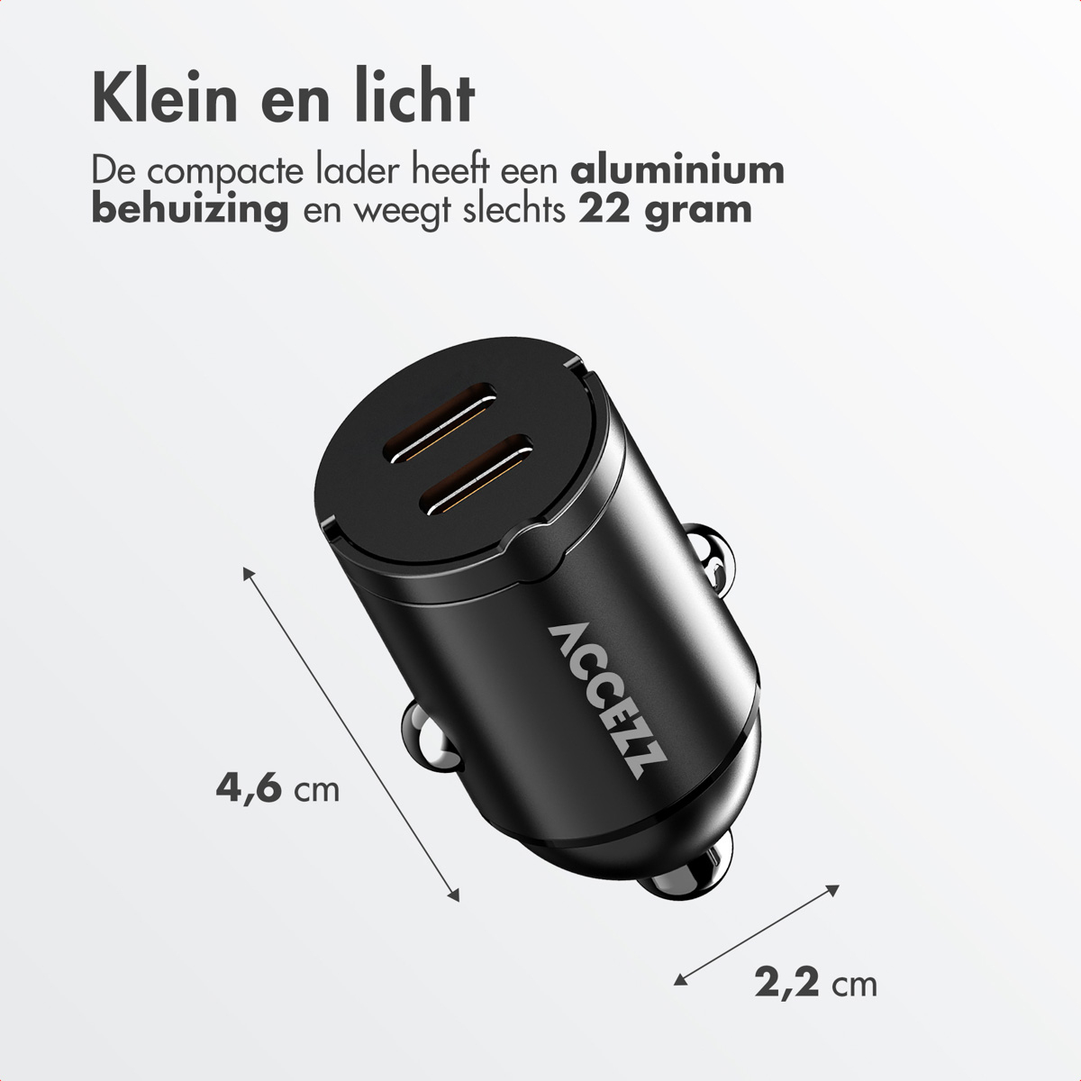 Gebruik je beide poorten? Dan wordt het vermogen verdeeld voor efficiënt opladen zonder oververhitting, beide poorten delen dan een vermogen van 20 watt. Easy Met een gewicht van slechts 22 gram en een aluminium behuizing is deze autolader zowel stijlvol als praktisch.