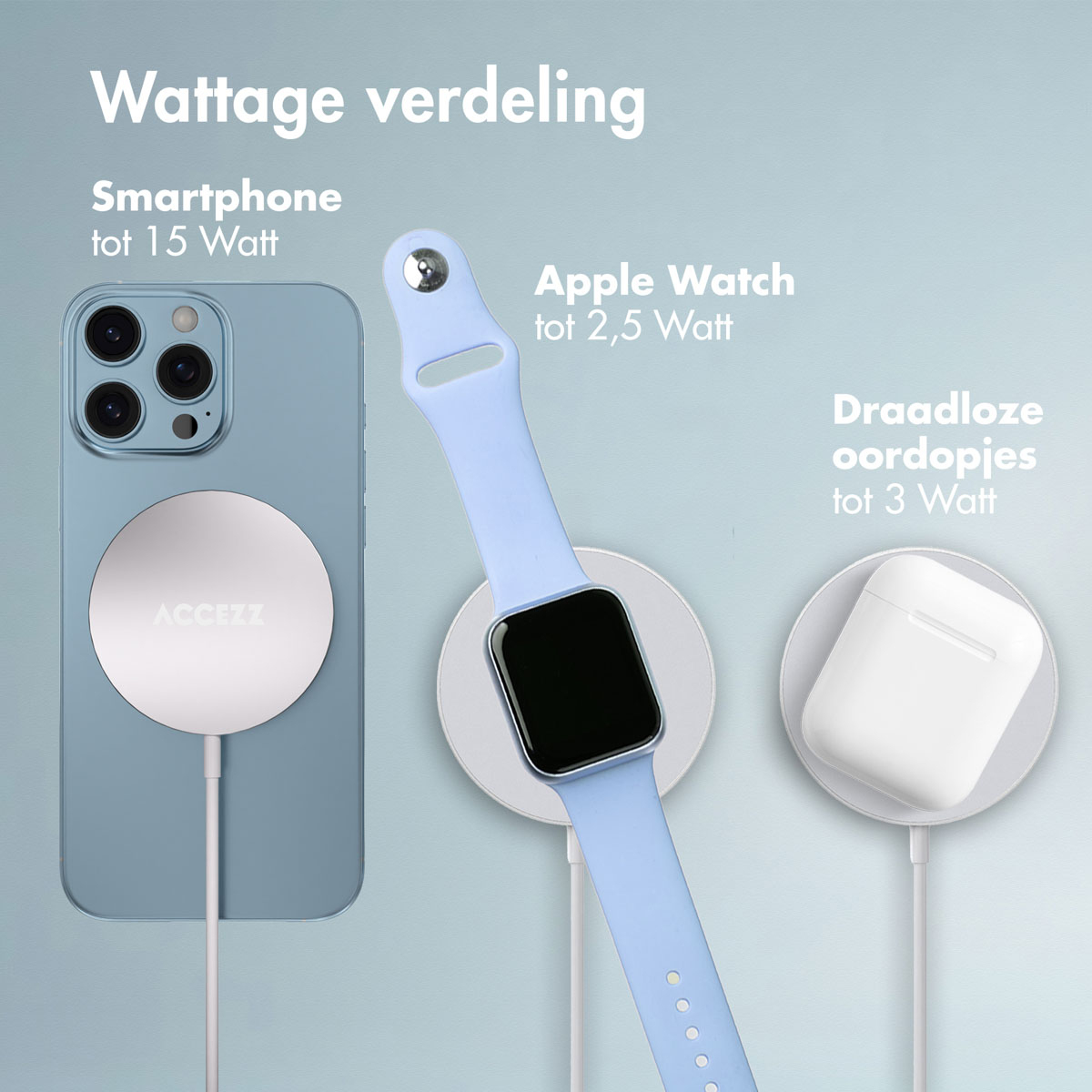 Multifunctioneel gebruik Met de Accezz Wireless MagSafe charger heb je nog maar één lader nodig voor je Apple accessoires. Laad je iPhone, Apple Watch én AirPods draadloos op, zonder gedoe met meerdere kabels: ideaal voor onderweg of thuis. De kabel is ook te gebruiken met USB-C poorten op laptops, computers of powerbanks maar werkt optimaal met een 18 Watt USB-C adapter (deze is niet meegeleverd).