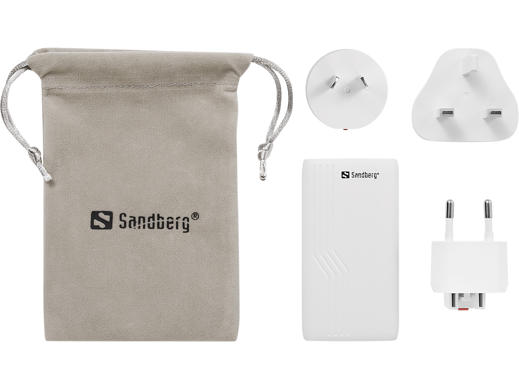 Sandberg 4in1 TravelCharger 2xUSB-C 65W is een krachtige en ultradunne reisoplader met twee USB-C PD-poorten. Hij levert tot 65W, zodat zelfs laptops snel kunnen worden opgeladen, en wanneer beide poorten in gebruik zijn, wordt het vermogen intelligent verdeeld (45W + 12W). De oplader wordt geleverd met een inklapbare US-stekker, die ook in grote delen van Azië past, en bevat adapters voor de EU, het VK en Australië, zodat je klaar bent voor de meeste delen van de wereld. De behuizing is brandwerend en robuust, perfect voor op reis.