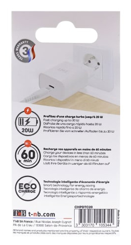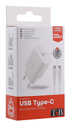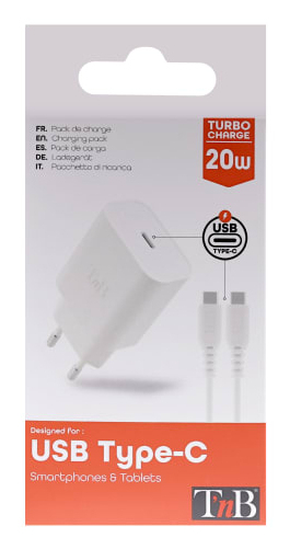 T'nB CHPDTC20. Type oplader: Binnen, Type stroombron: AC, Lader compatibiliteit: Smartphone, Smartwatch, Tablet, Aantal USB-Type-C-poorten: 1, Snel opladen. Snoerlengte: 1 m, Kleur van het product: Wit