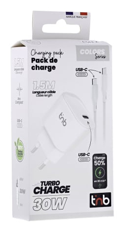 T'nB CHPDTC30WH. Type oplader: Binnen, Type stroombron: AC, Lader compatibiliteit: Universeel. Ingangsspanning: 100 - 240 V. Aantal USB-Type-C-poorten: 1. Snoerlengte: 1,5 m, Kleur van het product: Wit