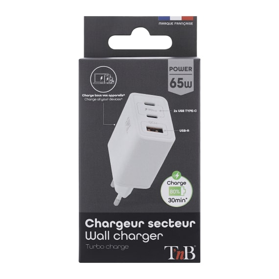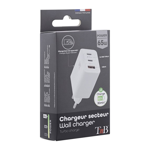 T'nB CHGAN65W. Type stroombron: AC, Lader compatibiliteit: Universeel. Ingangsspanning: 100 - 240 V, Uitgangsspanning (max): 20 V, AC-adapter, uitgangsstroom: 3 A. Aantal USB 2.0-poorten: 1, Aantal USB-Type-C-poorten: 2, Snel opladen. Kleur van het product: Wit