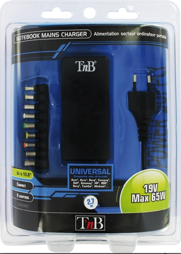 T'nB CHNB19V65. Type oplader: Binnen, Type stroombron: AC, Lader compatibiliteit: Laptop. Ingangsspanning: 100 - 240 V, Uitgangsspanning (max): 19 V. Snoerlengte: 2,7 m, Kleur van het product: Zwart