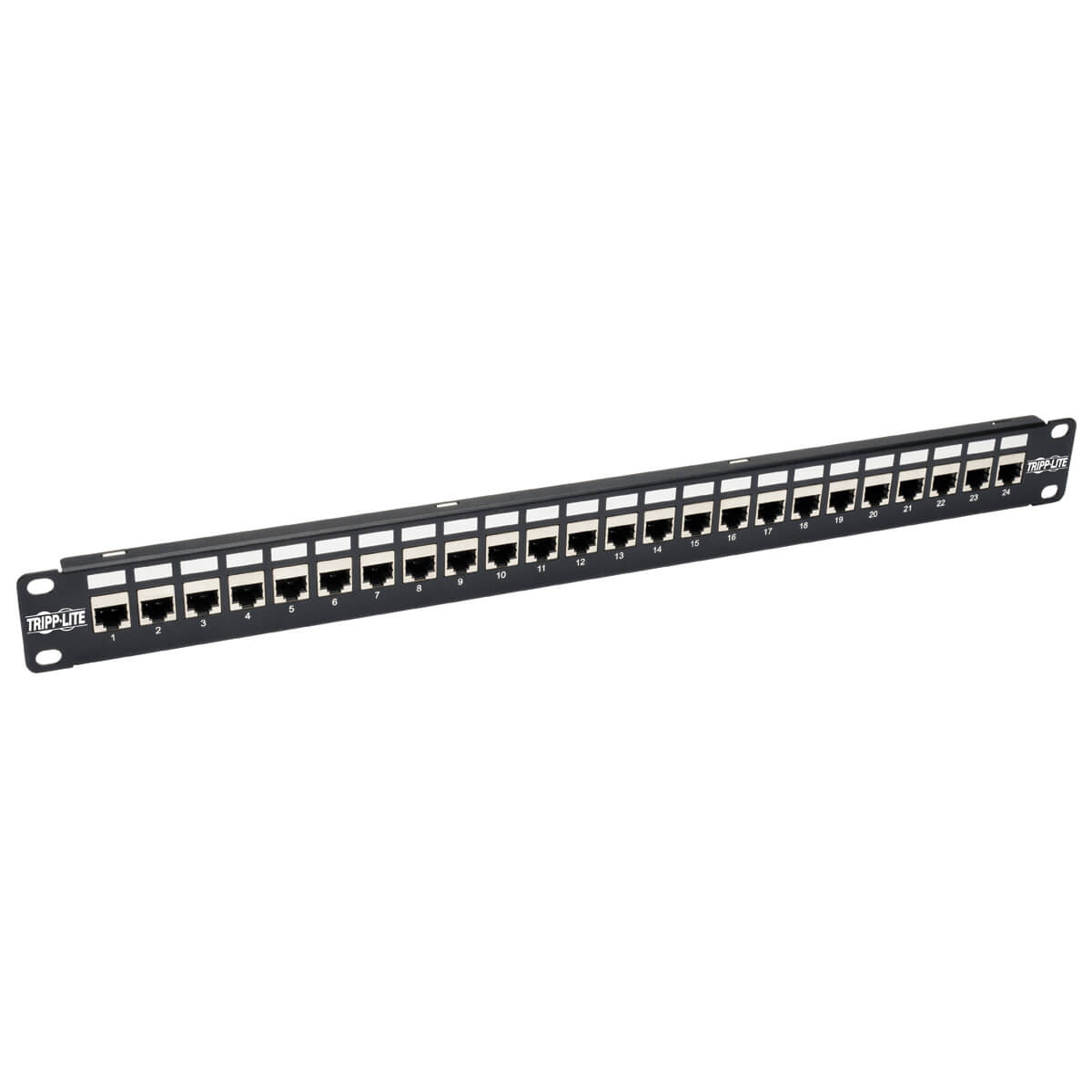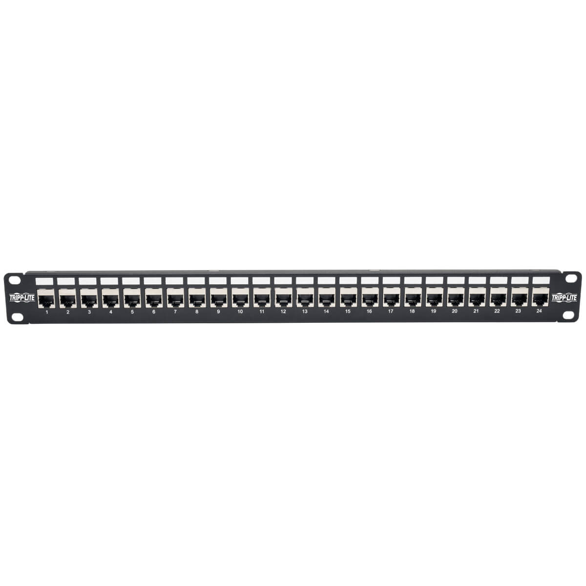 Tripp Lite N254-024-SH-6A. Ethernet interface type: 10 Gigabit Ethernet, Aansluiting(en): RJ-45, Ondersteundende kabel types: Cat6a. Montage: Rekmontage, Rackcapaciteit: 1U, Kleur van het product: Zwart. Certificaten van naleving: RoHS, Certificering: TAA. Breedte: 482,6 mm, Hoogte: 43,2 mm, Diepte: 31,8 mm. Breedte verpakking: 73,9 mm, Diepte verpakking: 70,1 mm, Hoogte verpakking: 500,1 mm