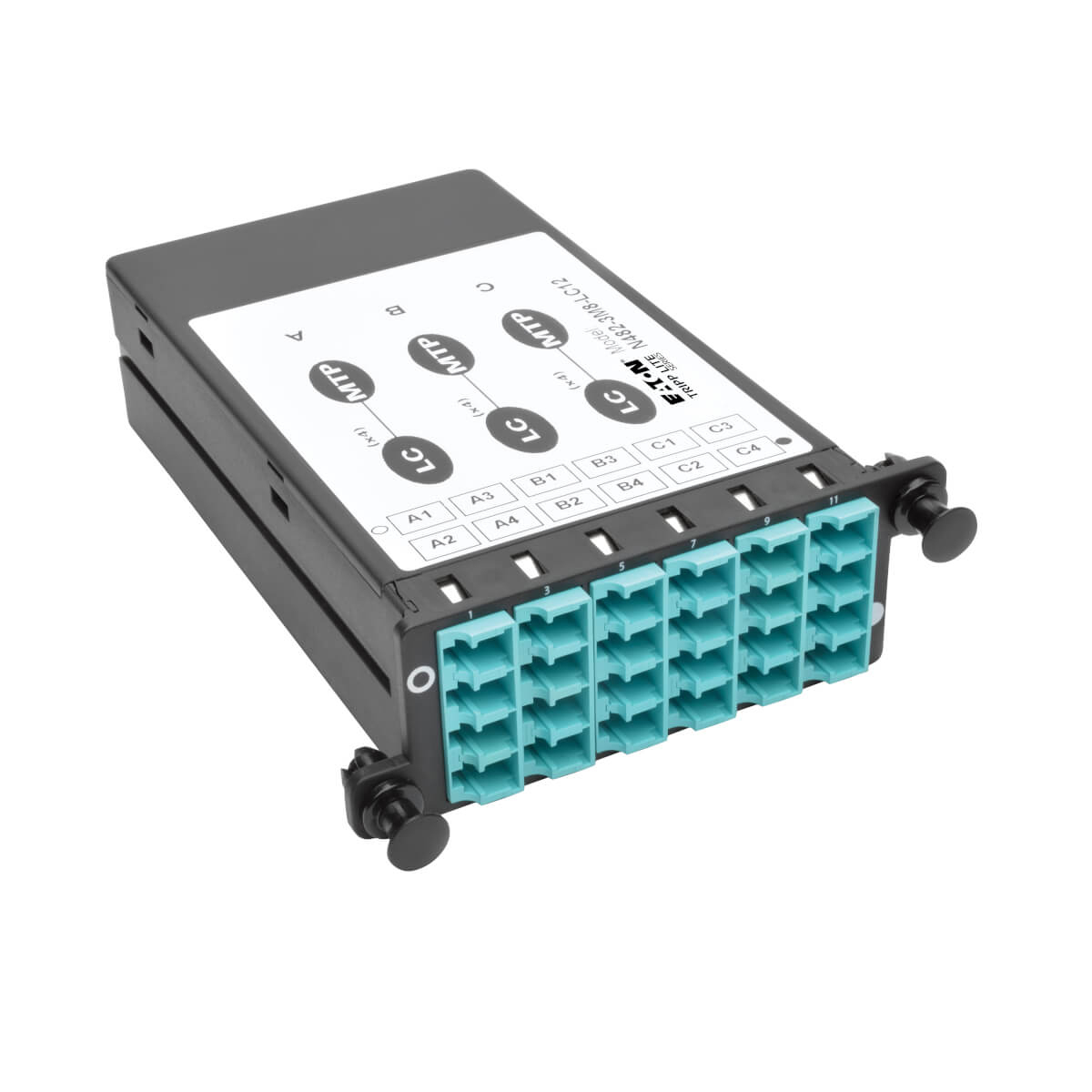 Tripp Lite 40/100Gb Breakout Cassette, 40Gb to 4 x 10Gb, 100Gb to 4 x 25Gb (x3) 8-Fiber OM4 MTP/MPO (Male with Pins) to (x12) LC Duplex, Type-B Polarity Patchpaneel - Blauw,Grijs kenmerken