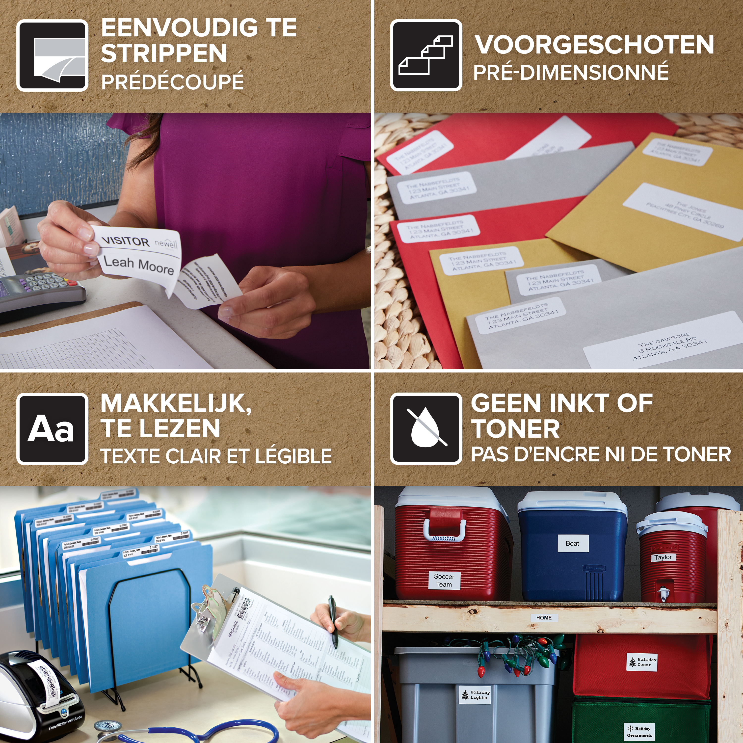 Originele DYMO LabelWriter-labels zijn een efficiënte en kosteneffectieve oplossing voor al uw behoeften op het gebied van post, verzenden en organiseren. Dankzij de rechtstreekse thermische printtechnologie die zonder inkt of toner afdrukt, geniet u van meer labeling en minder inktverspilling. LW-labels komen in rollen met labels op maat, waardoor het gemakkelijk is om één of honderden verzendlabels af te drukken zonder het gedoe van vellen, afval of labelstoringen. LabelWriter-labels zijn ontworpen voor de DYMO 550/450-serie, 5XL/4XL en draadloze LabelWriter labelmakers.