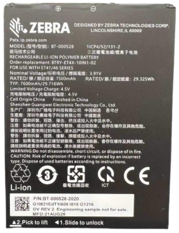 Zebra BTRY-ET401-10INC-01, Batterij/Accu, Zebra, 10” ET401, Lithium-Ion (Li-Ion), 7500 mAh, 3,91 V