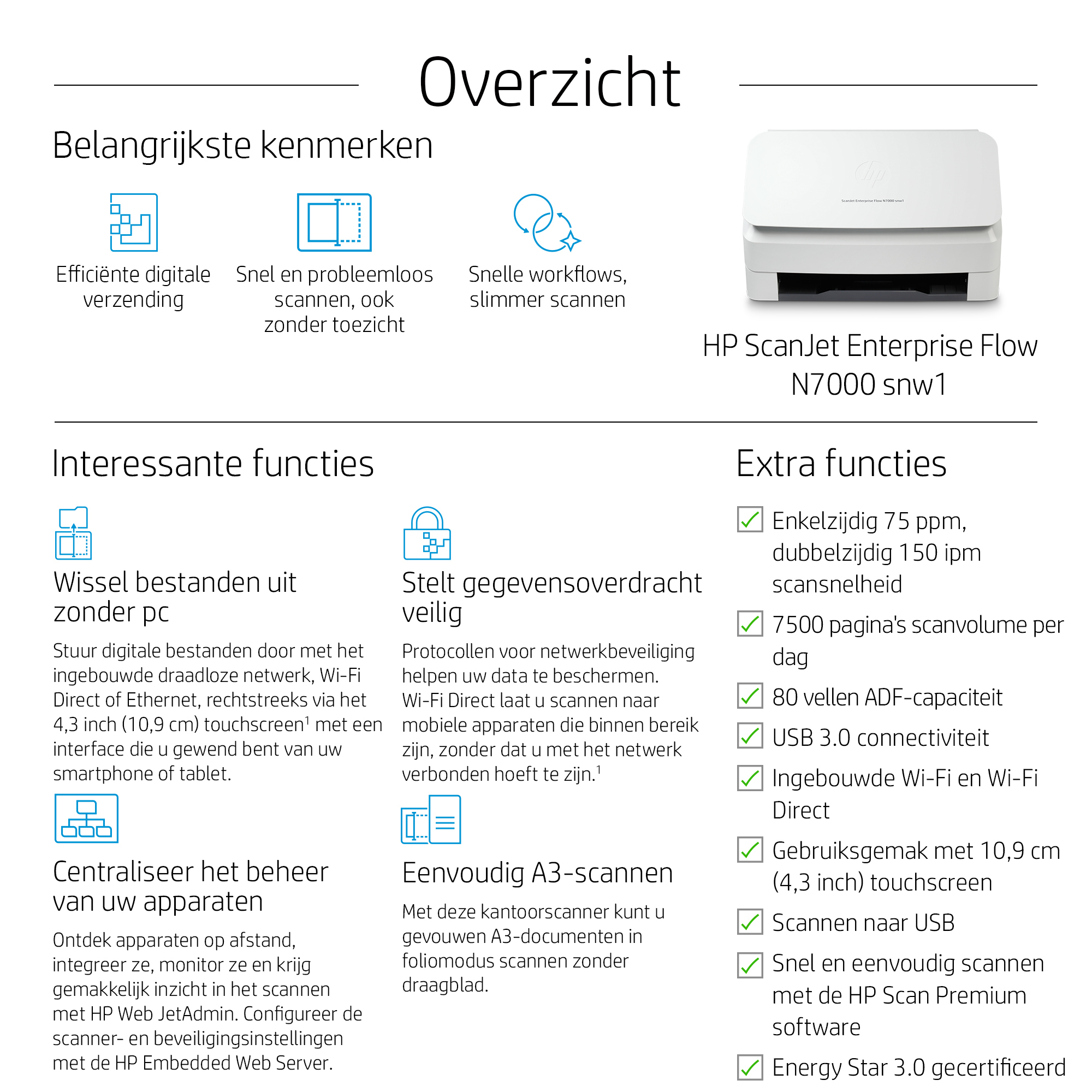 HP ScanJet Enterprise Flow N7000 snw1, 216 x 3098 mm, 600 x 600 DPI, 48 Bit, 24 Bit, Paginascanner, Wit