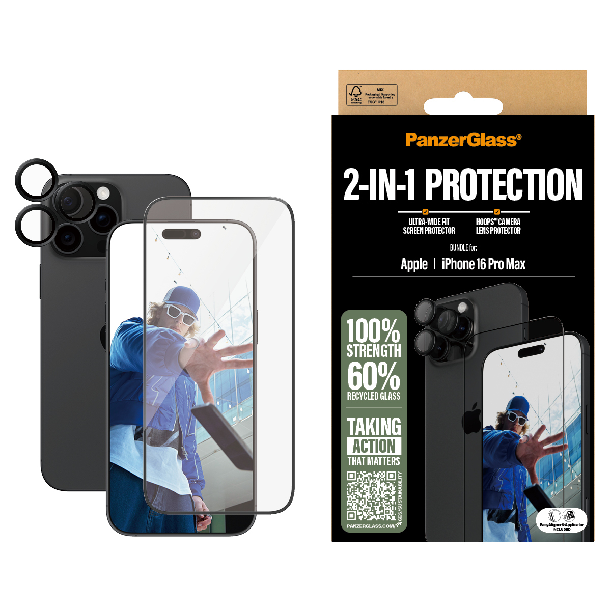 PanzerGlass ® 2-in-1 Bundle iPhone 16 Pro Max, Apple, Apple - iPhone 16 Pro Max, Droge toepassing, Krasbestendig, Schokbestendig, Transparant, 1 stuk(s)