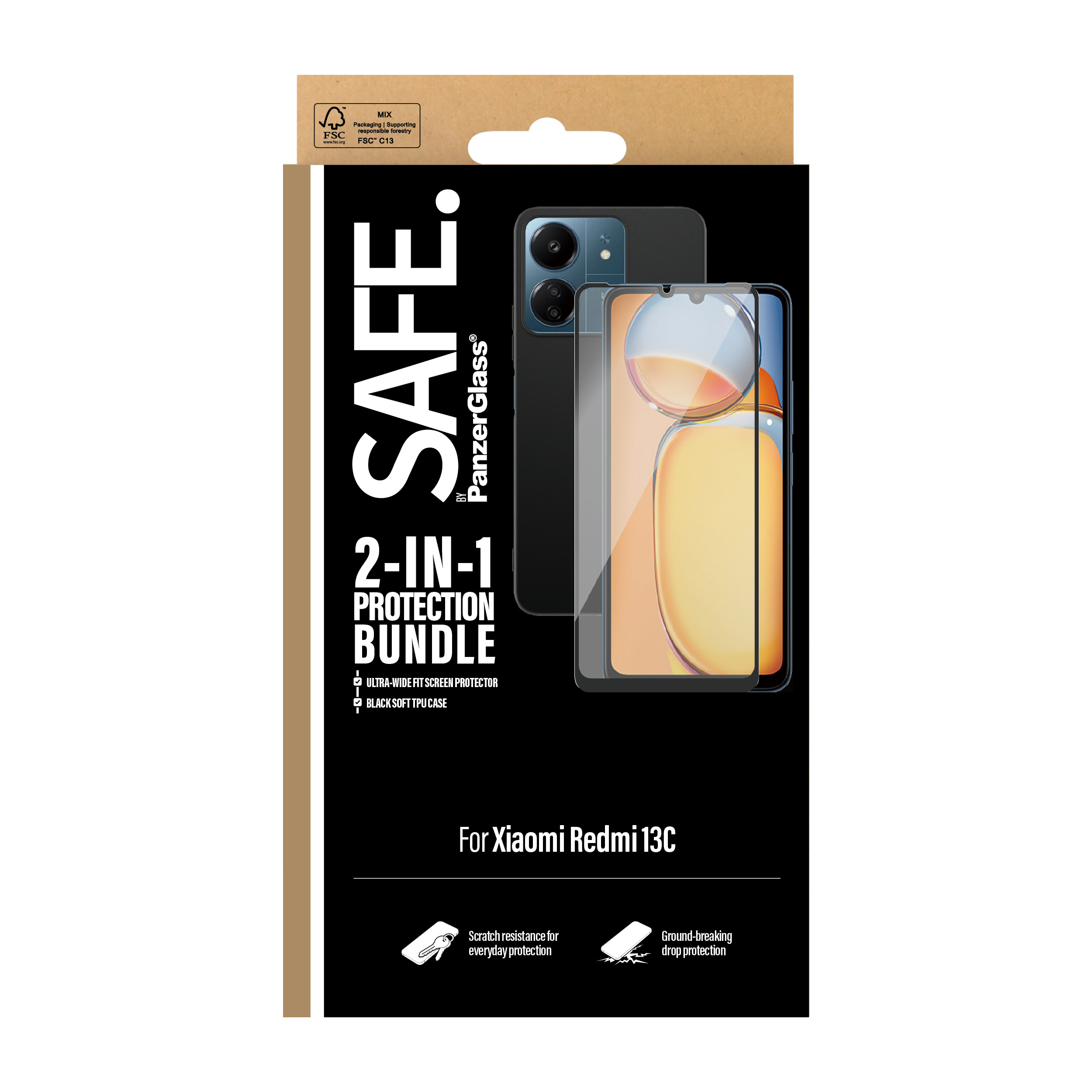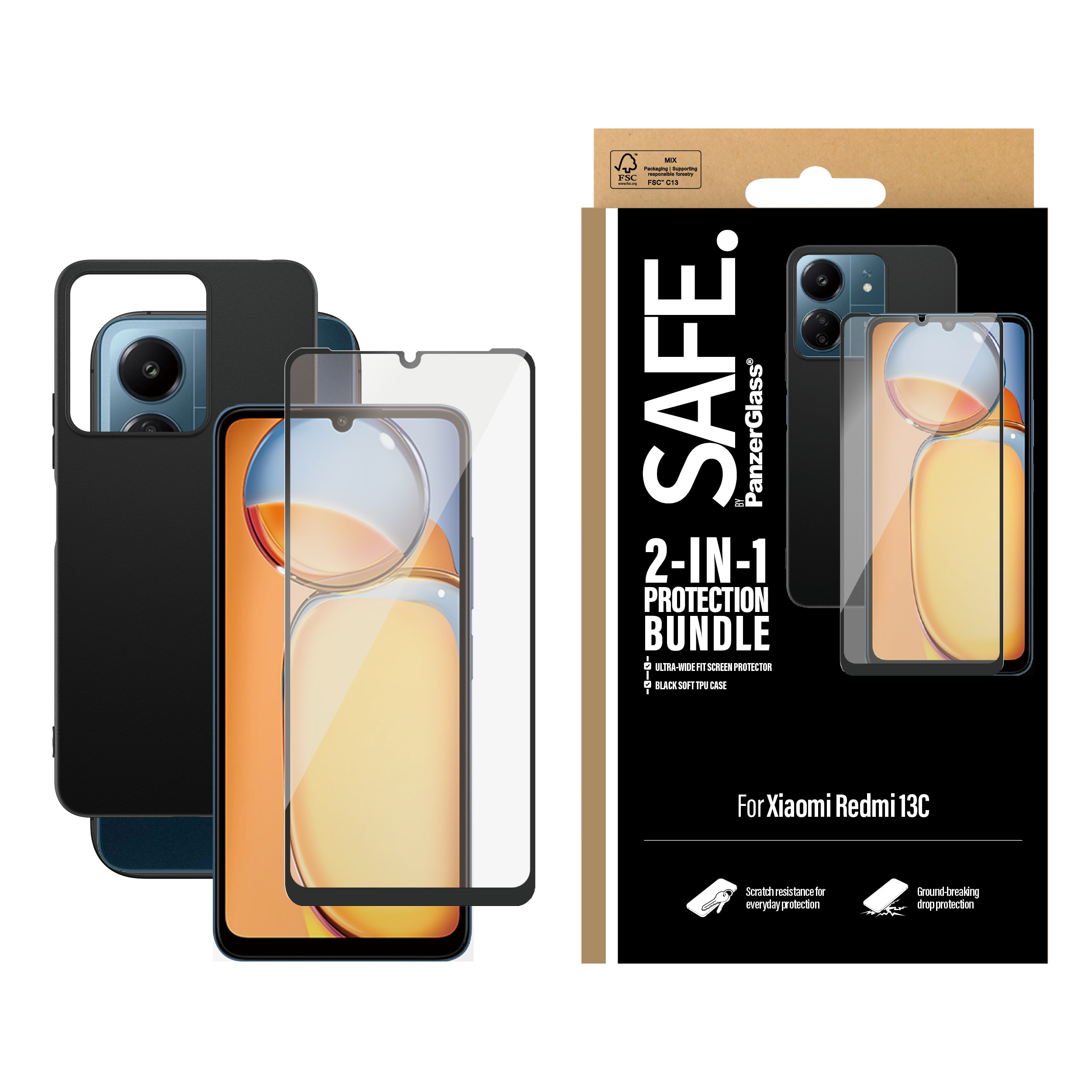 PanzerGlass SAFE. by ® 2-in-1 Bundle Xiaomi Redmi 13C, Xiaomi, Xiaomi - Redmi 13C 4G, Droge toepassing, Krasbestendig, Schokbestendig, Transparant, 1 stuk(s)