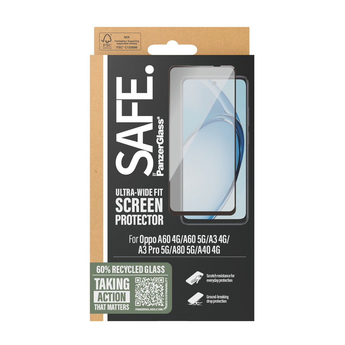 PanzerGlass SAFE. by ® Screen Protector w. Black Frame Oppo A60 4G | A60 5G | A3 4G | A3 Pro 5G | A80 5G | A40 4G | Ultra-Wide Fit, OPPO, OPPO - A60 4G, OPPO - A60 5G, OPPO - A3 4G, OPPO - A3 Pro 5G, OPPO - A80 5G, OPPO - A40 4G, Droge toepassing, Krasbes