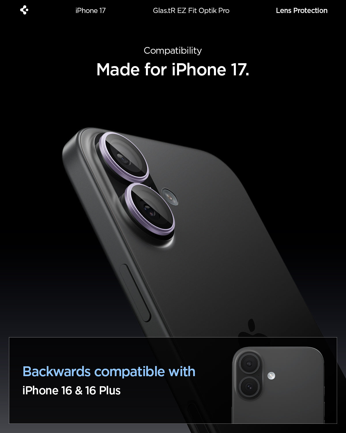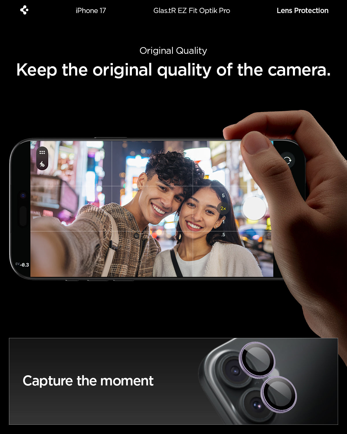 Spigen Optik Pro EZ Fit. Merkcompatibiliteit: Apple, Compatibiliteit: iPhone 17, Veiligheidsfunties: Valbestendig, Krasbestendig. Materiaal: Gehard glas, Kleur van het product: Paars. Aantal per verpakking: 2 stuk(s)