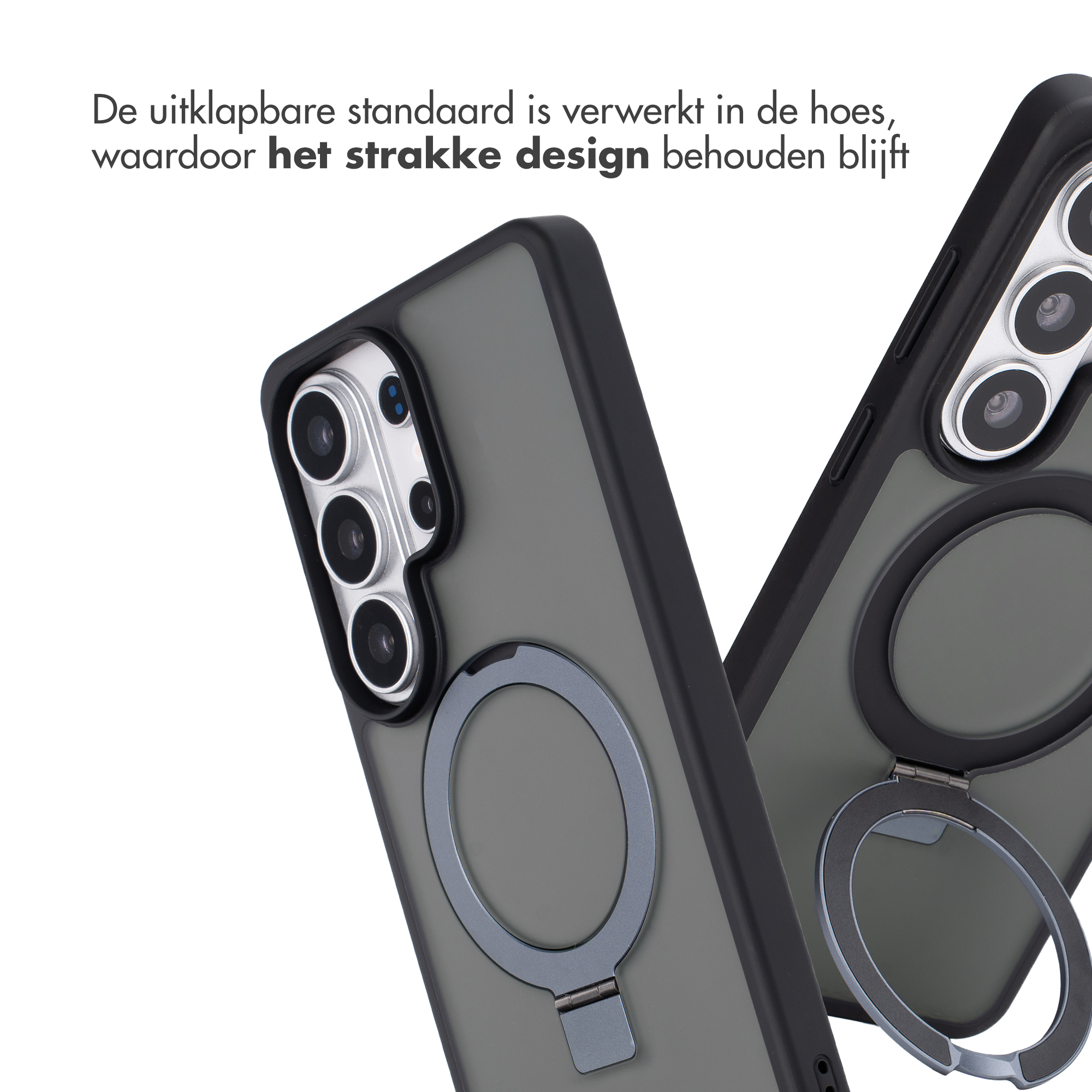 Denk hierbij aan aan een magnetische draadloze oplader, ringgreep of een telefoonhouder. De krachtige magneet zorgt ervoor dat deze accessoires altijd op de ideale plek koppelen en er niet zomaar afvallen. Uitklapbare standaard Met de handige uitklapbare standaard, zet jij je telefoon moeiteloos neer.