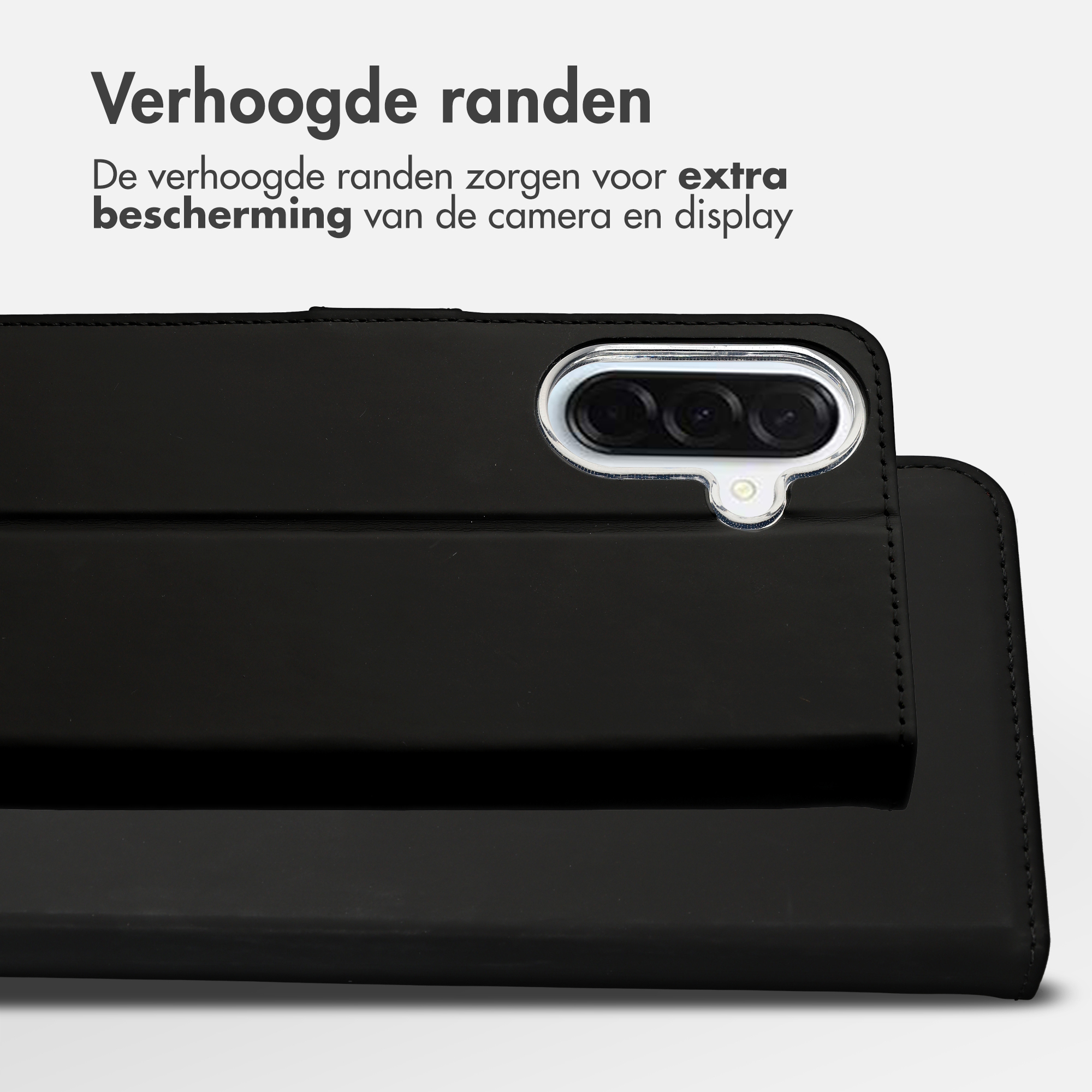 Dagelijkse bescherming van telefoon en camera Aan de binnenkant van de booktype is een flexibele siliconen houder aangebracht. De hoes beschikt over verhoogde randen, waardoor de camera en de display van je telefoon beschermd zijn. Door de krachtige magneetsluiting blijft de hoes goed afgesloten, zelfs tijdens een val of stoot.