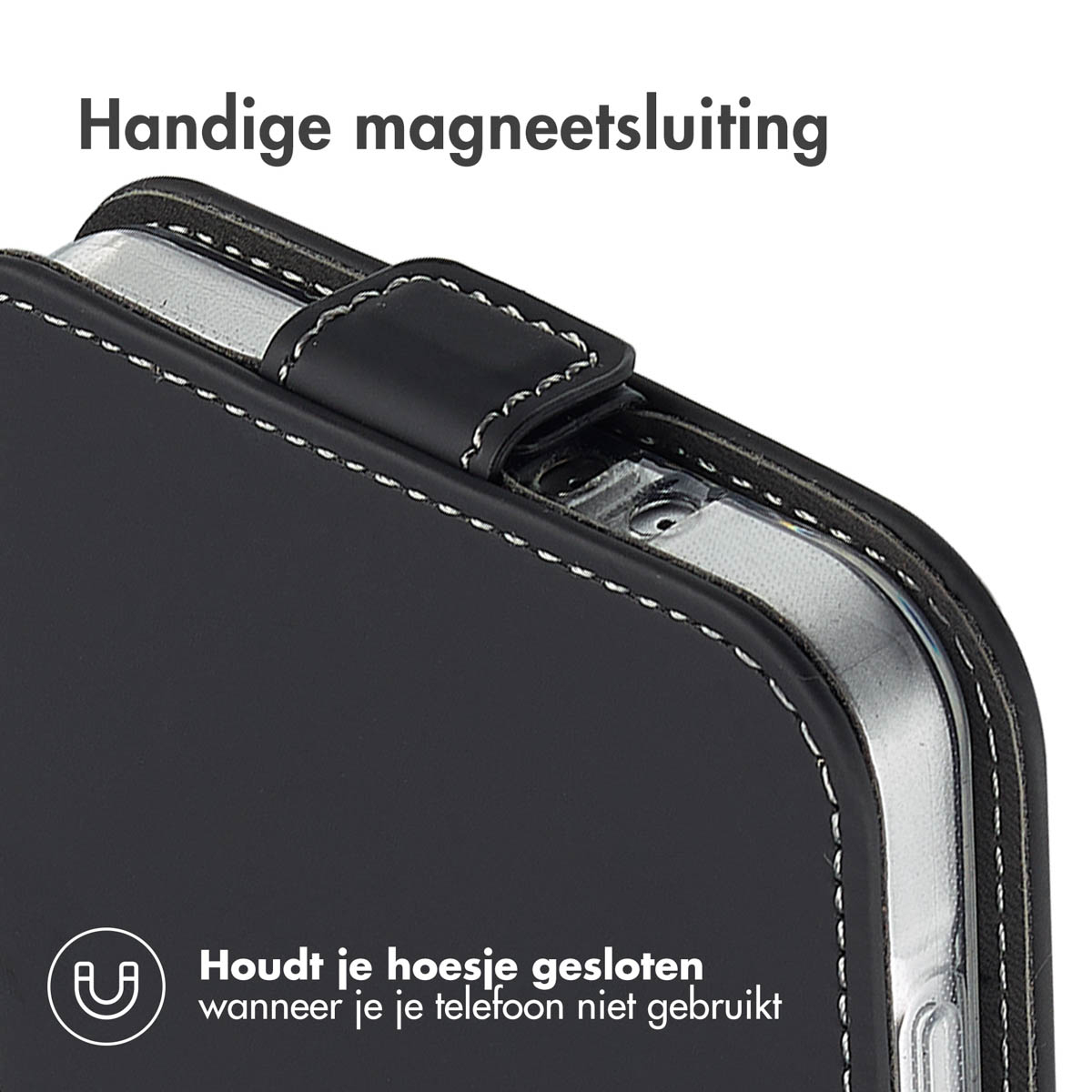 Sterke magneetsluiting Deze Flipcase heeft een magneetsluiting aan de bovenzijde van de hoes. De magneetsluiting maakt de hoes zeer gebruiksvriendelijk. Zo open je de hoes eenvoudig met één hand, zodat je je telefoon snel opneemt of bedient.