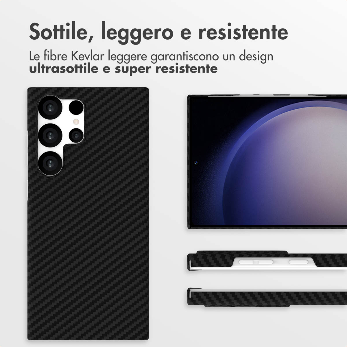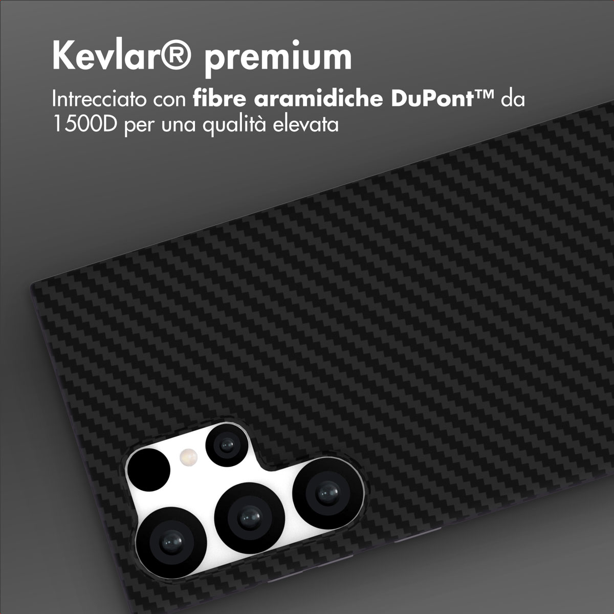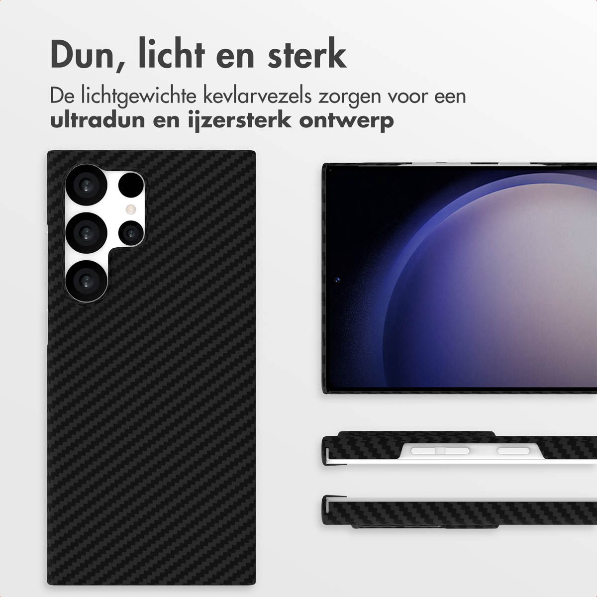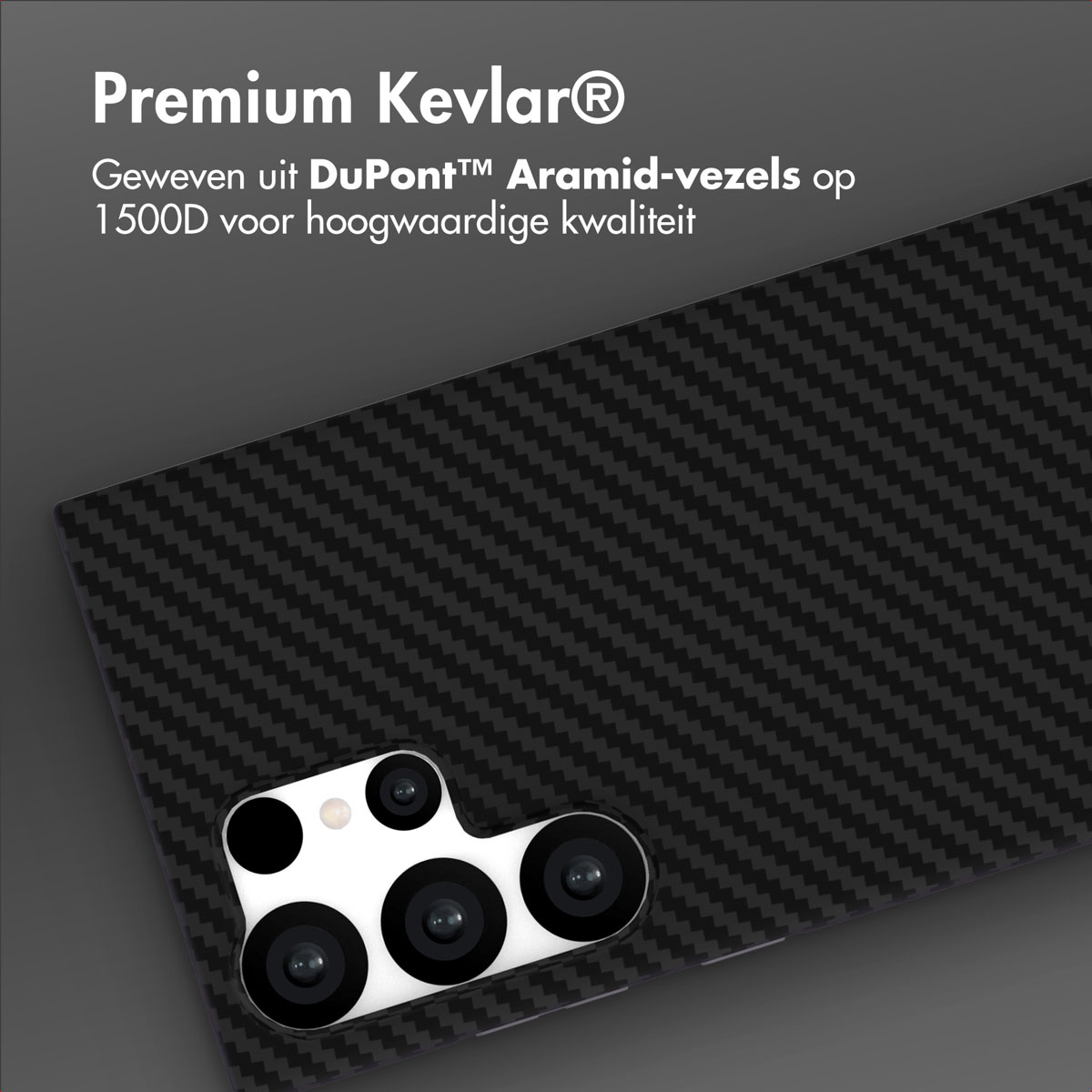 Kevlar Deze backcover is gemaakt van hoogwaardig Kevlar®, specifiek geweven uit DuPont™ Aramid-vezels op 1500D. Dit zorgt voor een hoesje dat niet alleen ultradun en lichtgewicht is, maar ook buitengewoon sterk met de look van Carbon Fiber. De lichtgewichte kevlarvezels bieden een uitzonderlijk duurzaam en ijzersterk ontwerp dat je toestel optimaal beschermt tegen dagelijkse stoten, krassen en slijtage, zonder dat het volume toevoegt.