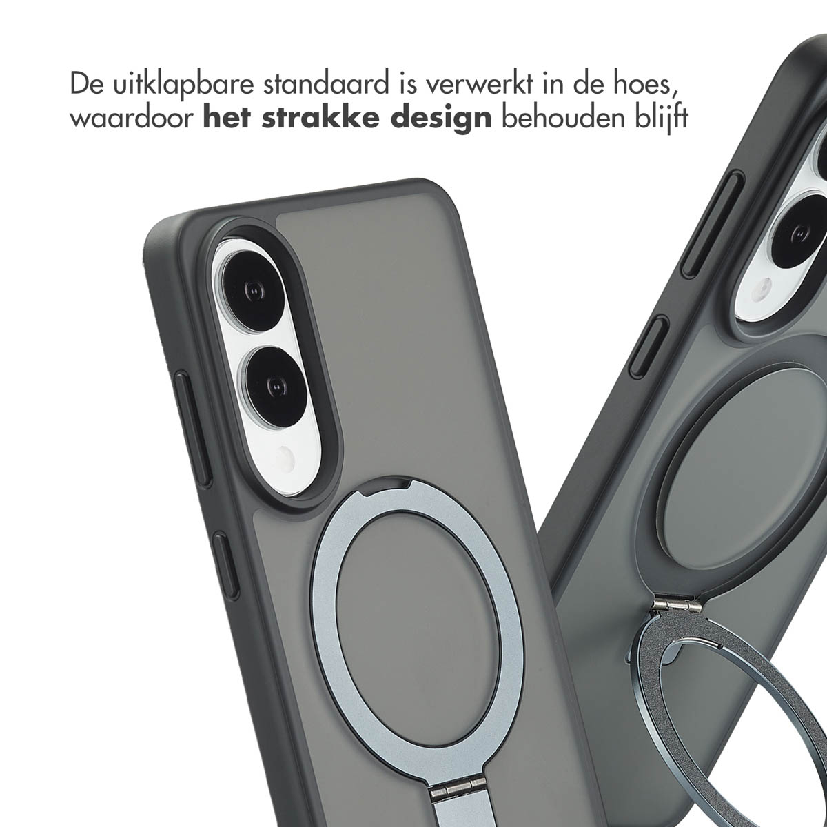 Denk hierbij aan aan een magnetische draadloze oplader, ringgreep of een telefoonhouder. De krachtige magneet zorgt ervoor dat deze accessoires altijd op de ideale plek koppelen en er niet zomaar afvallen. Uitklapbare standaard Met de handige uitklapbare standaard, zet jij je telefoon moeiteloos neer.