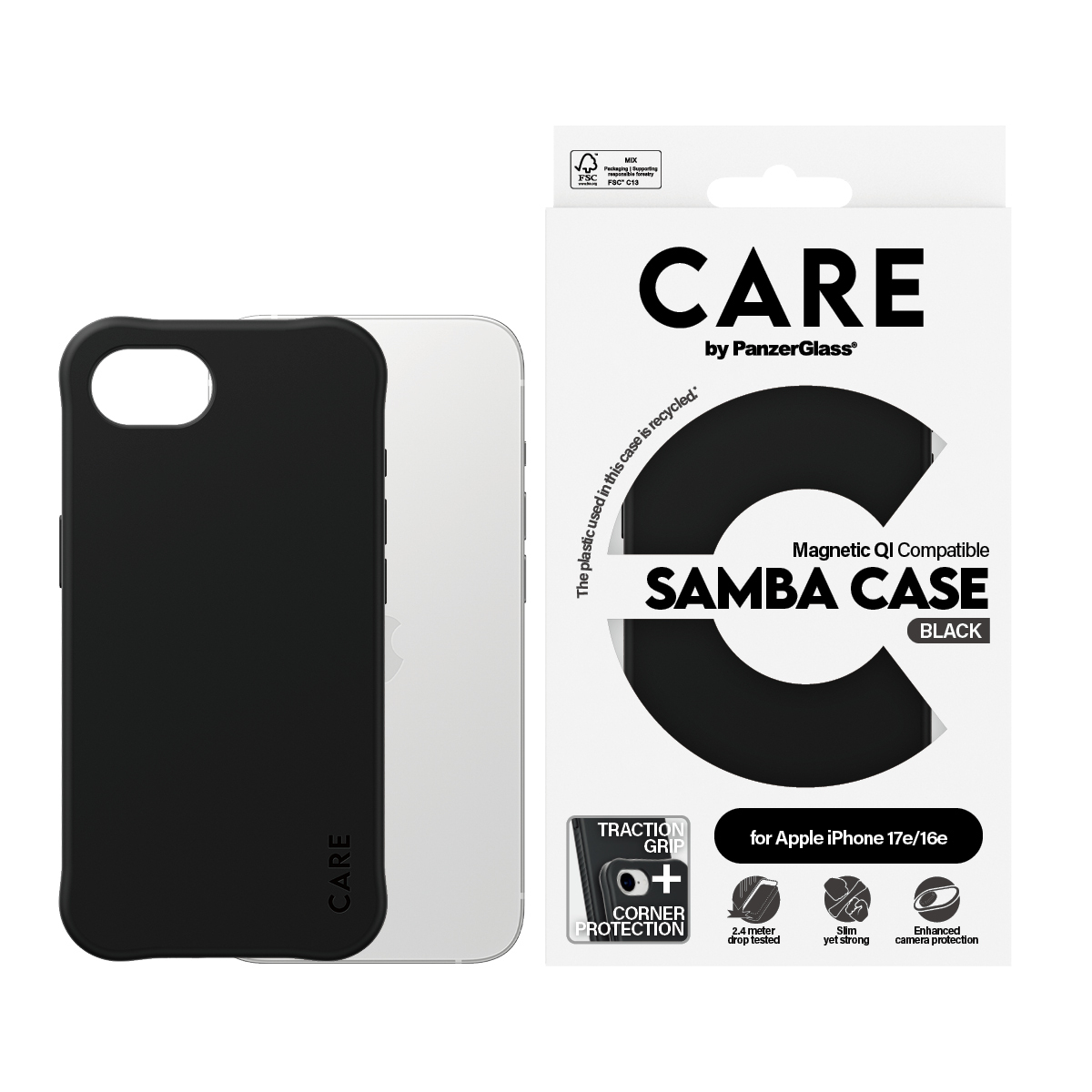 PanzerGlass CARE™ by ® Samba Case Black w. Qi Compatible iPhone 17e | 16e. Type etui: Hoes, Merkcompatibiliteit: Apple, Compatibiliteit: Apple - iPhone 16e, Apple - iPhone 17e, Kleur van het product: Zwart