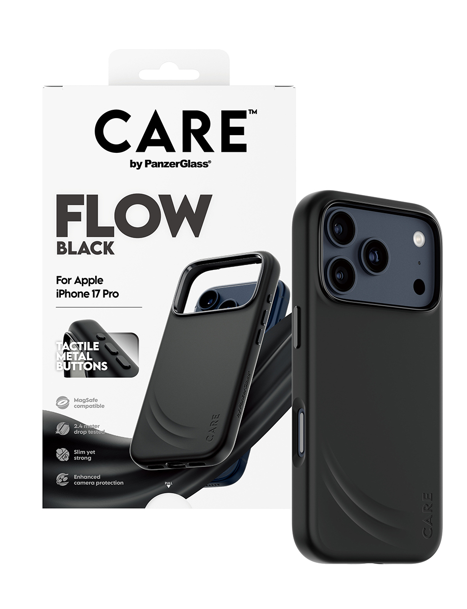 PanzerGlass CARE by ® Feature FLOW Case Black w. MagSafe iPhone 17 Pro. Type etui: Hoes, Merkcompatibiliteit: Apple, Compatibiliteit: Apple - iPhone 17 Pro, Oppervlakte kleur: Monochromatisch, Kleur van het product: Zwart