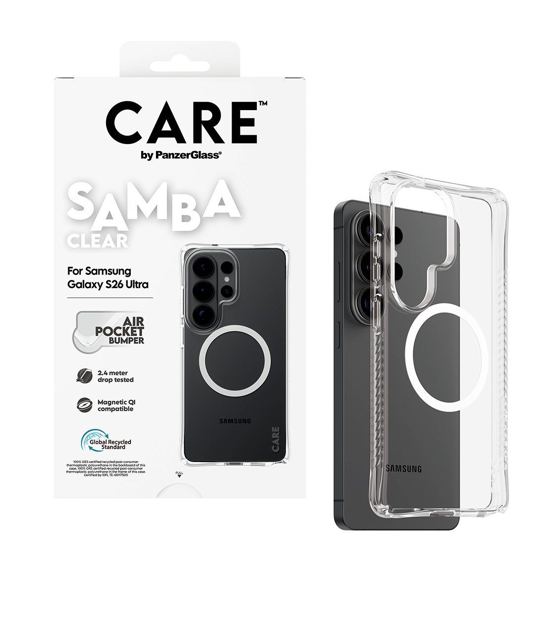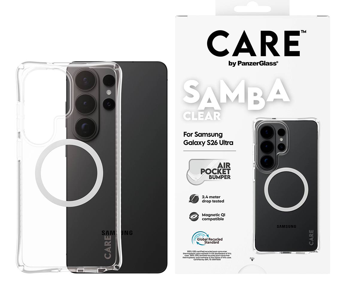 PanzerGlass CARE™ by ® Samba Case Transparent w. White Qi Samsung Galaxy S26 Ultra. Type etui: Hoes, Merkcompatibiliteit: Samsung, Compatibiliteit: Samsung - Galaxy S26 Ultra, Maximale schermgrootte: 17,5 cm (6.9"), Oppervlakte kleur: Monochromatisch, Kleur van het product: Transparant