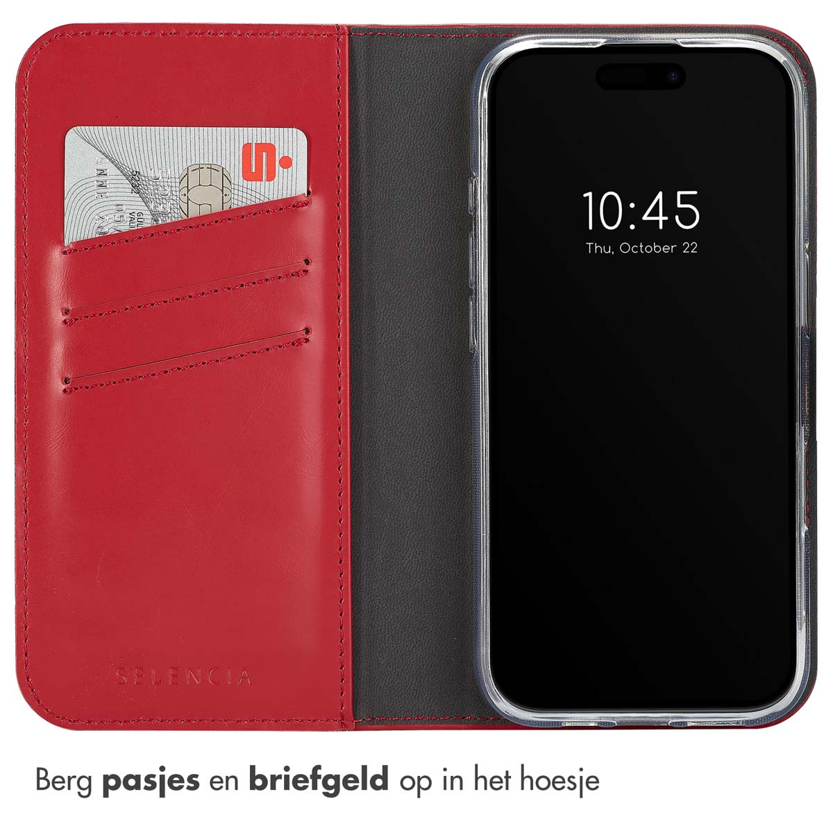 Jouw Apple iPhone 16 Pro Max staat prachtig in de Selencia Echt Leren Bookcase in rood. Het zachte, echte leder voelt prettig in de hand en krijgt met gebruik een natuurlijke glans. Er is ruimte voor drie pasjes en briefgeld, een krachtige magneetsluiting houdt alles veilig gesloten.