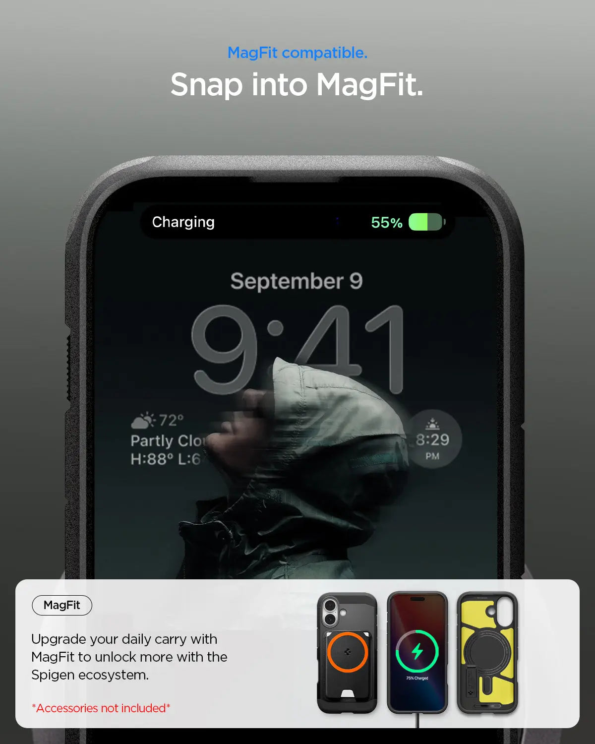 Spigen Tough Armor T (MagFit). Type etui: Hoes, Merkcompatibiliteit: Apple, Compatibiliteit: iPhone 17, Maximale schermgrootte: 16 cm (6.3"), Oppervlakte kleur: Monochromatisch, Kleur van het product: Donkergrijs, Bureaustandaard