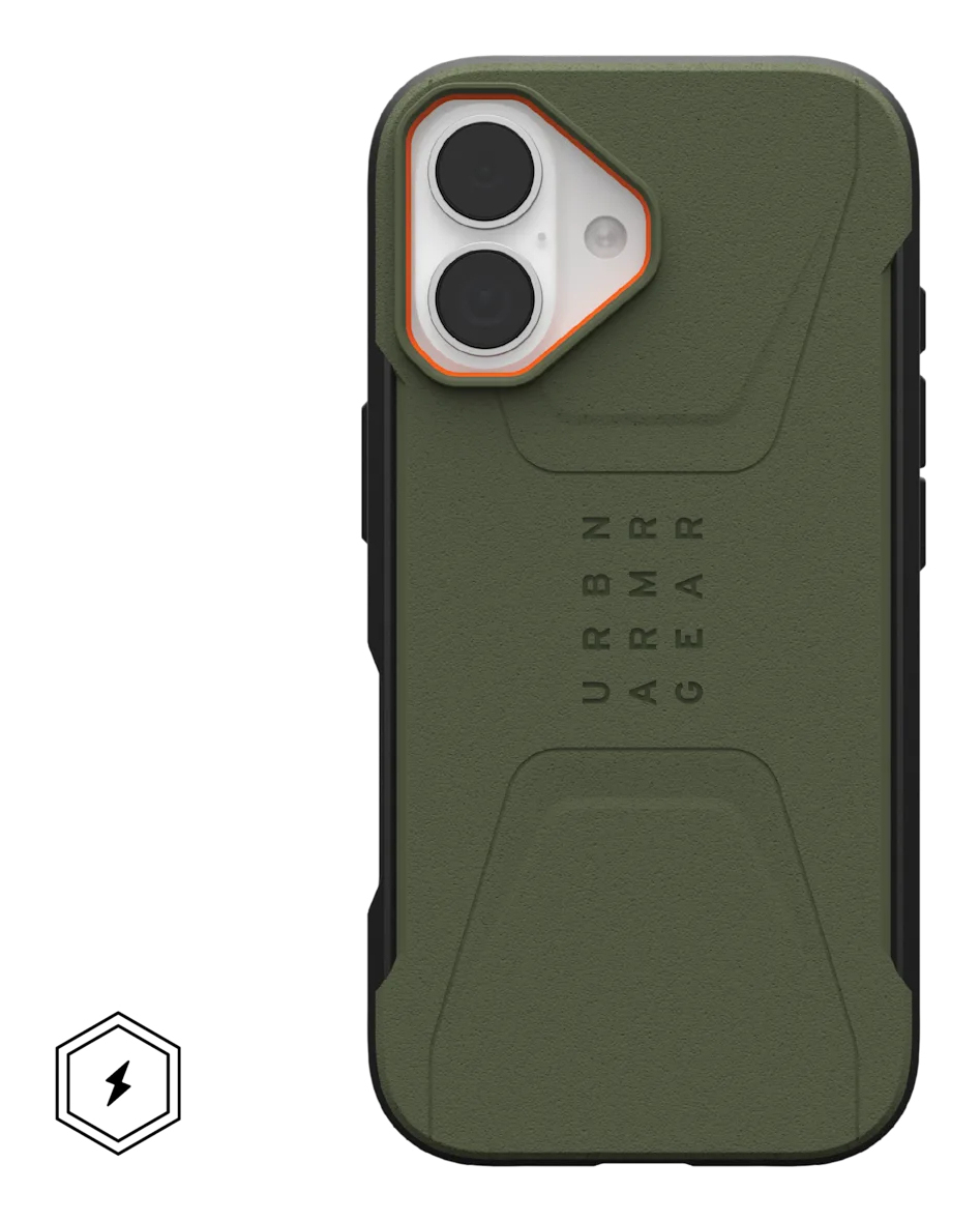 Urban Armor Gear 114547117297. Type etui: Hoes, Merkcompatibiliteit: Apple, Compatibiliteit: iPhone 17, Maximale schermgrootte: 16 cm (6.3"), Oppervlakte kleur: Monochromatisch, Kleur van het product: Olijf, Oranje