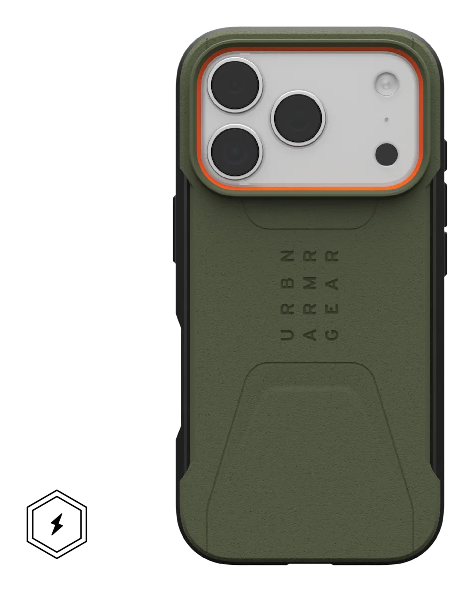 Urban Armor Gear 114545117297. Type etui: Hoes, Merkcompatibiliteit: Apple, Compatibiliteit: iPhone 17 Pro, Maximale schermgrootte: 16 cm (6.3"), Oppervlakte kleur: Monochromatisch, Kleur van het product: Olijf, Oranje