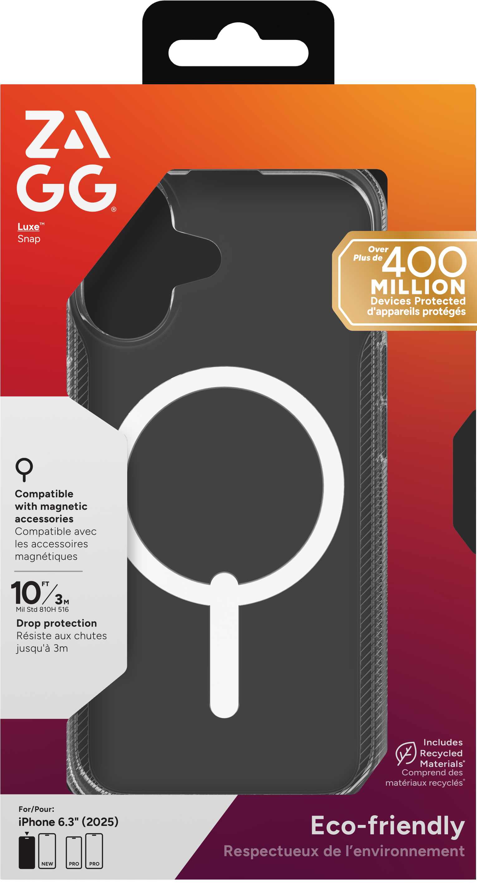 ZAGG Luxe Snap. Type etui: Hoes, Merkcompatibiliteit: Apple, Compatibiliteit: iPhone 17, Maximale schermgrootte: 16 cm (6.3"), Kleur van het product: Transparant