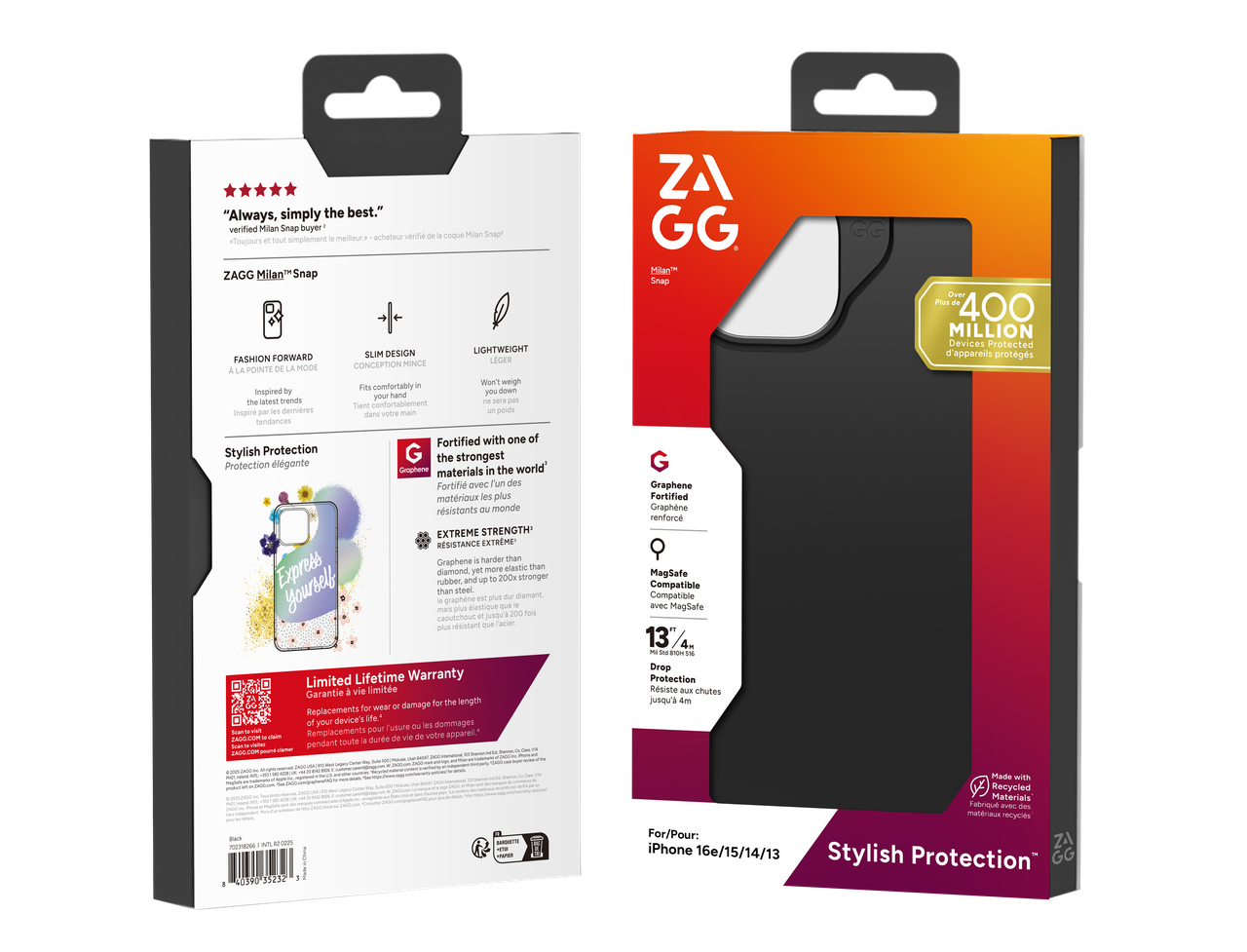 ZAGG Milan Snap. Type etui: Hoes, Merkcompatibiliteit: Apple, Compatibiliteit: iPhone 17e/16e/15/14/13, Maximale schermgrootte: 15,5 cm (6.1"), Oppervlakte kleur: Monochromatisch, Kleur van het product: Zwart