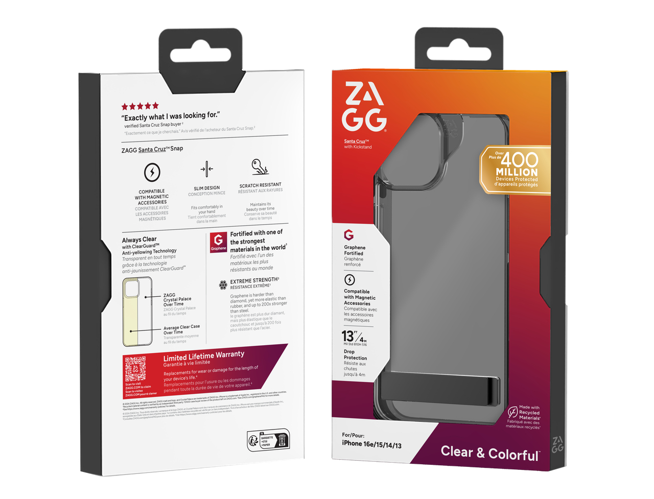 ZAGG Santa Cruz Kickstand. Type etui: Hoes, Merkcompatibiliteit: Apple, Compatibiliteit: iPhone 17e/16e/15/14/13, Maximale schermgrootte: 15,5 cm (6.1"), Kleur van het product: Zwart, Bureaustandaard