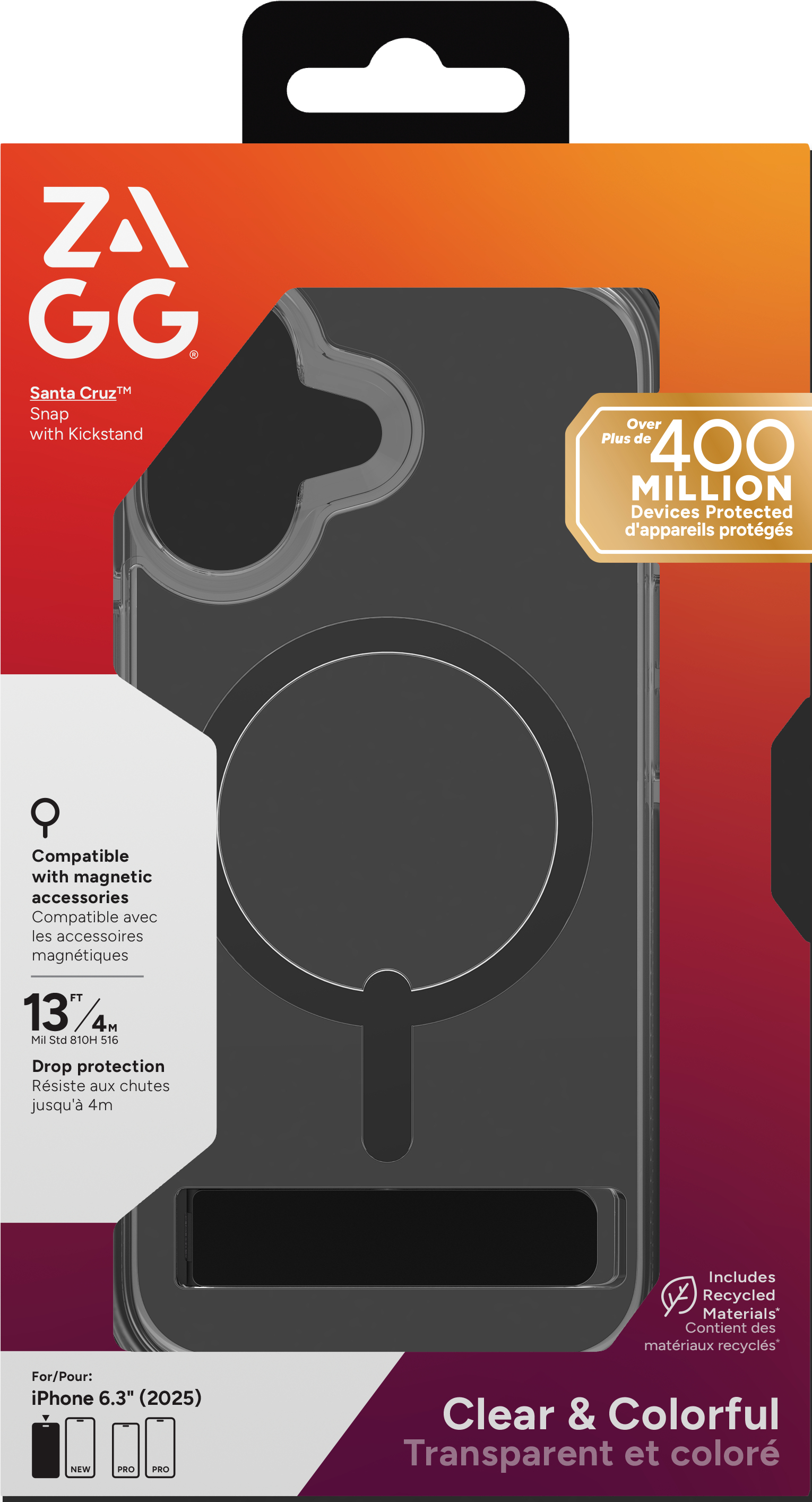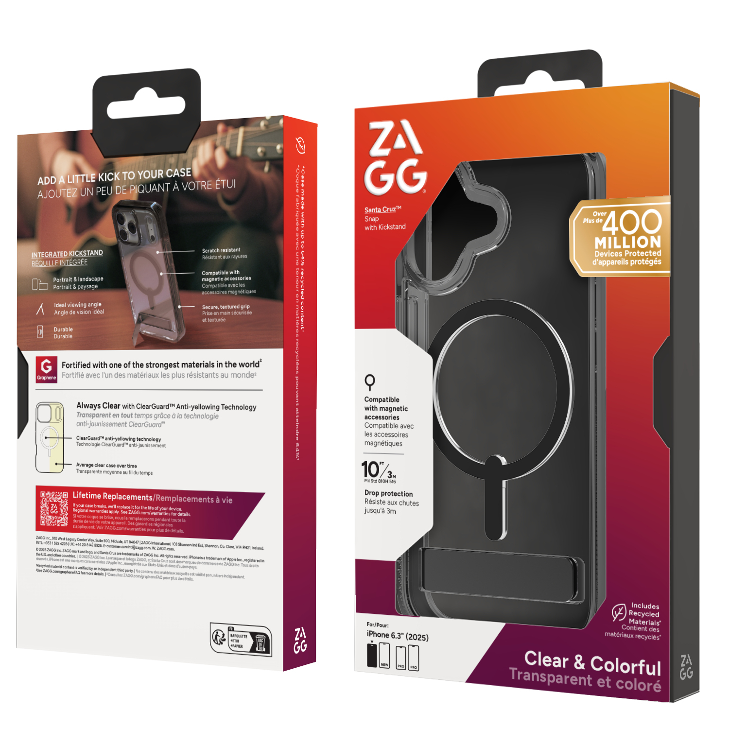 ZAGG Santa Cruz Snap Kickstand. Type etui: Hoes, Merkcompatibiliteit: Apple, Compatibiliteit: iPhone 17, Maximale schermgrootte: 16 cm (6.3"), Kleur van het product: Zwart, Transparant, Bureaustandaard