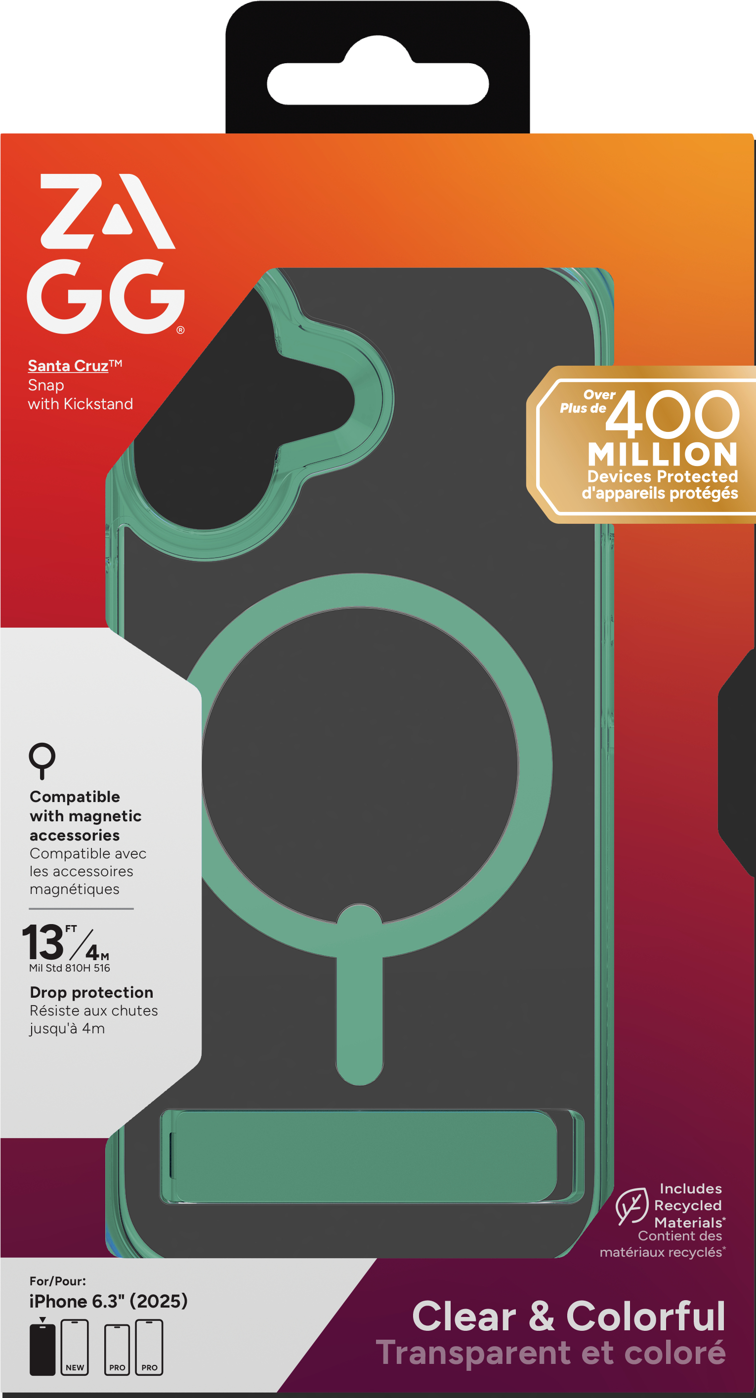 ZAGG Santa Cruz Snap Kickstand. Type etui: Hoes, Merkcompatibiliteit: Apple, Compatibiliteit: iPhone 17, Maximale schermgrootte: 16 cm (6.3"), Kleur van het product: Groen, Transparant, Bureaustandaard