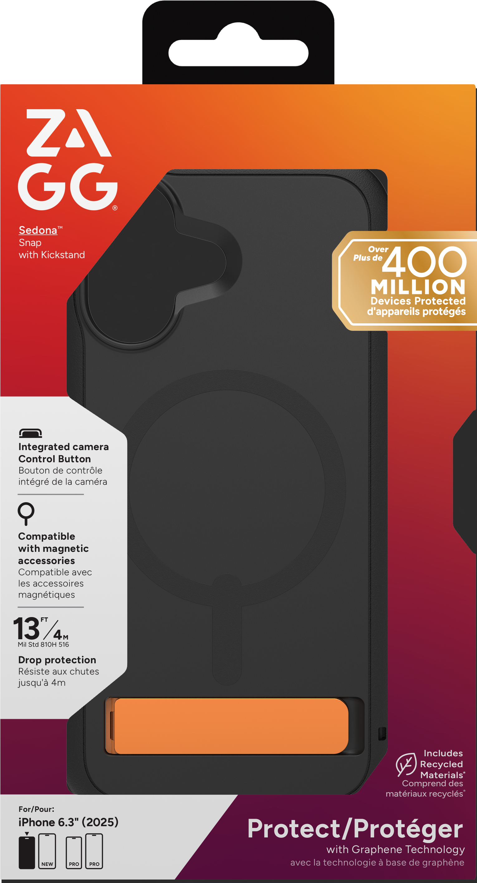 ZAGG Sedona Snap Kickstand. Type etui: Hoes, Merkcompatibiliteit: Apple, Compatibiliteit: iPhone 17, Maximale schermgrootte: 16 cm (6.3"), Kleur van het product: Zwart, Bureaustandaard
