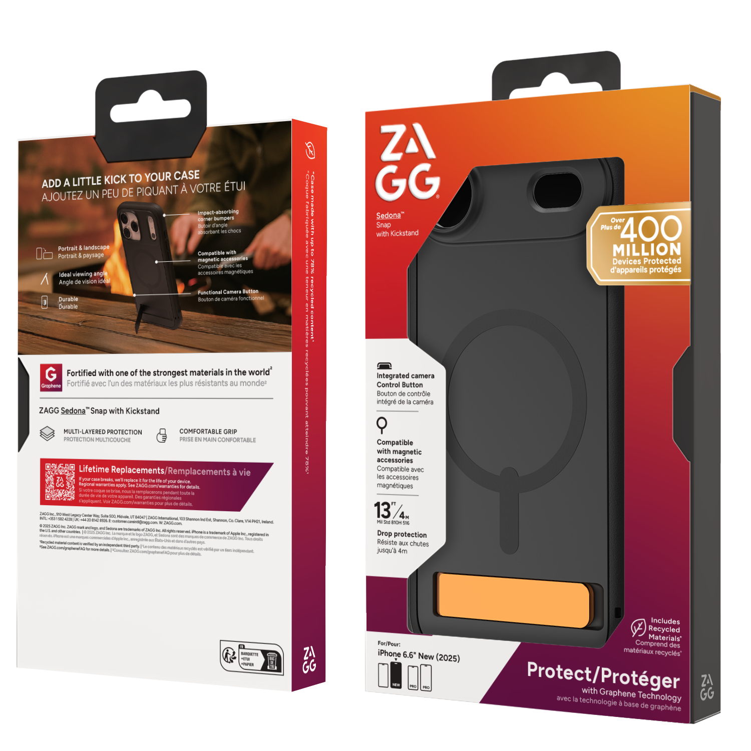 ZAGG Sedona Snap Kickstand. Type etui: Hoes, Merkcompatibiliteit: Apple, Compatibiliteit: iPhone 17 Air, Maximale schermgrootte: 16,5 cm (6.5"), Kleur van het product: Zwart, Bureaustandaard