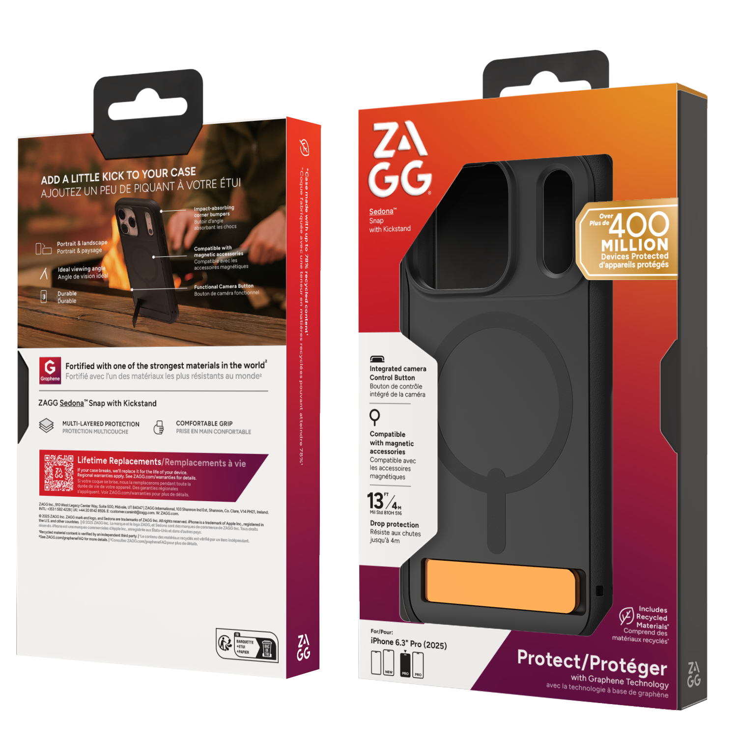 ZAGG Sedona Snap Kickstand. Type etui: Hoes, Merkcompatibiliteit: Apple, Compatibiliteit: iPhone 17, Maximale schermgrootte: 16 cm (6.3"), Kleur van het product: Zwart, Bureaustandaard
