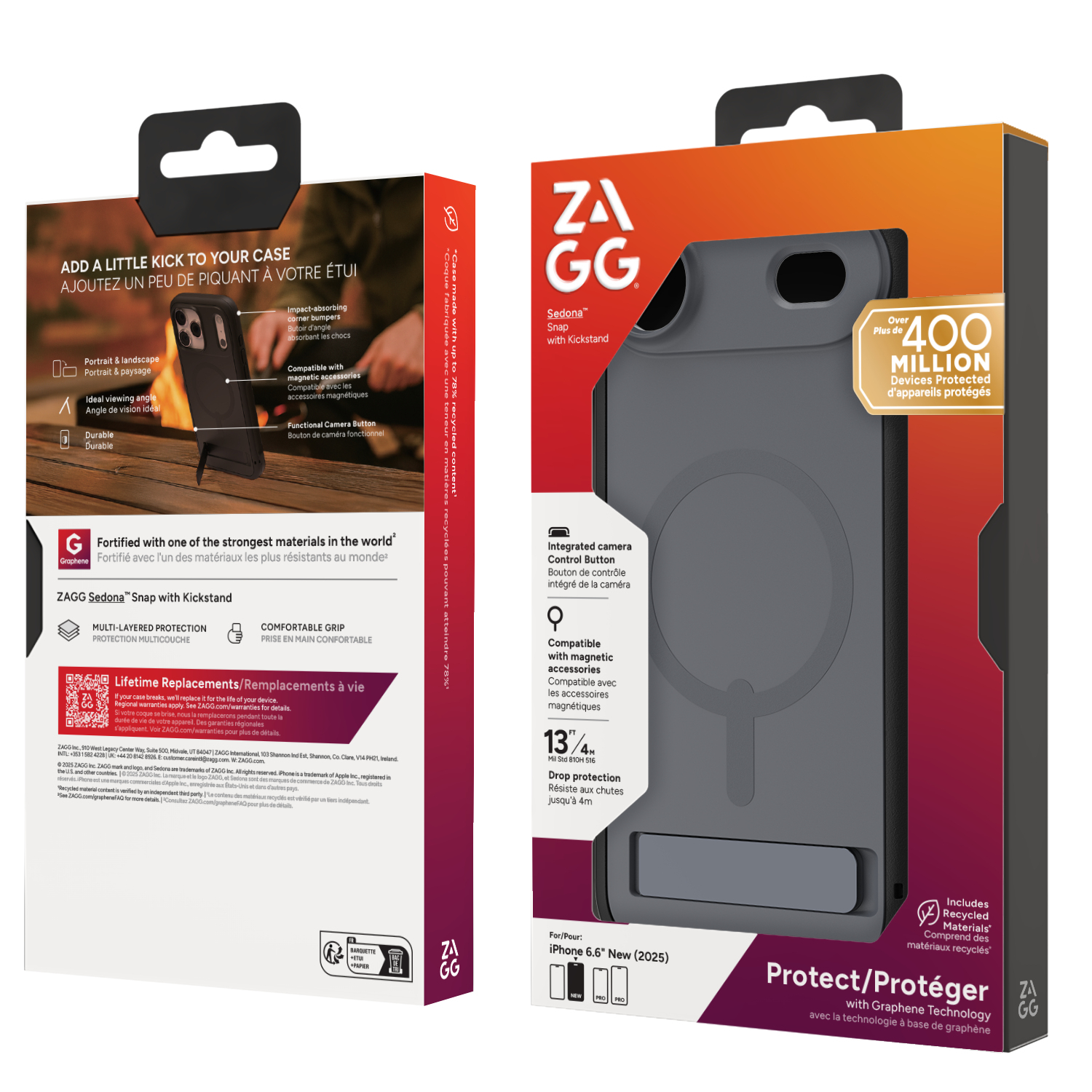 ZAGG Sedona Snap Kickstand. Type etui: Hoes, Merkcompatibiliteit: Apple, Compatibiliteit: iPhone 17 Air, Maximale schermgrootte: 16,5 cm (6.5"), Kleur van het product: Houtskool, Bureaustandaard