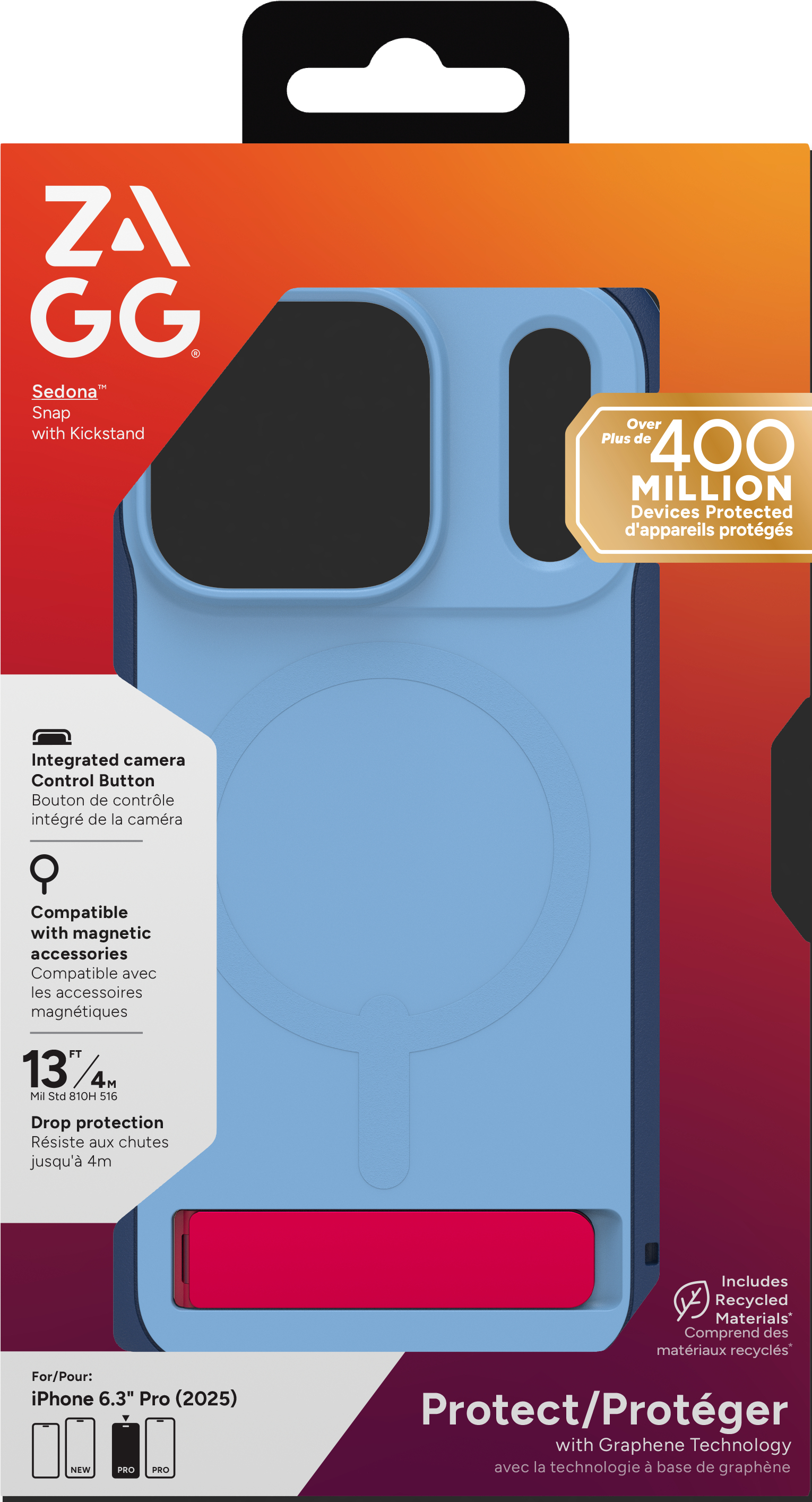 ZAGG Sedona Snap Kickstand. Type etui: Hoes, Merkcompatibiliteit: Apple, Compatibiliteit: iPhone 17 Pro, Maximale schermgrootte: 16 cm (6.3"), Kleur van het product: Blauw, Bureaustandaard